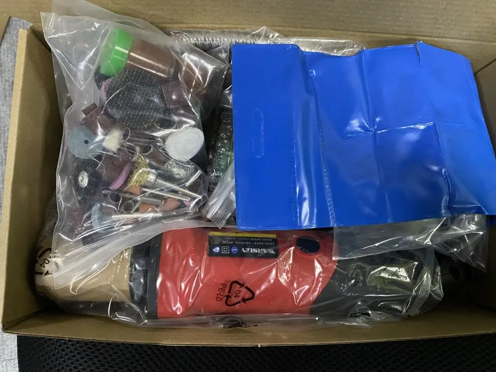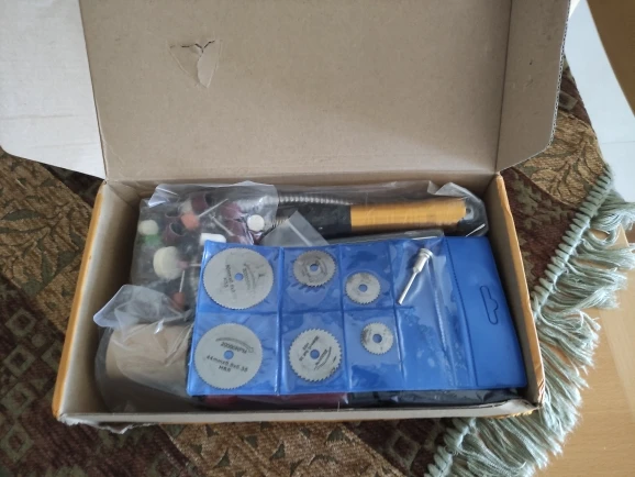 Все прибыло быстро, а это не удивительно, ведь с российского склада. Но вот коробка прям из того самого места. Но главное что товар целый и я бы советовал брать набор, ведь он неплох за свою цену. Как минимум стоимость окупает гибкий вал, который точно такой же на просторах Али стоит чуть ли не всю разницу между сетом без всего и сетом со всеми расходниками и валом. Конечно расходники все мягко говоря такие себе, но для бытовых нужд или на первое время вполне сойдёт. А когда уже определитесь что вам нужней всего, заказать нормальные, теже Dremel. А отрезные диски можно из диска болгарки на сверлить(обычный диск 30рублей пилится на штук 10 мини дисков). В любом случае штука стоит своих денег, единственное хотелось бы прикрутить модификацию которая поддерживает обороты(на Ютубе для хильды такое делают), но мощи тут столько, что впринципе эта модификация не нужна(но всеровно хотелось). Надеюсь в Китае доберутся до этих видосов и будут изначально выпаивать туда мод. плату