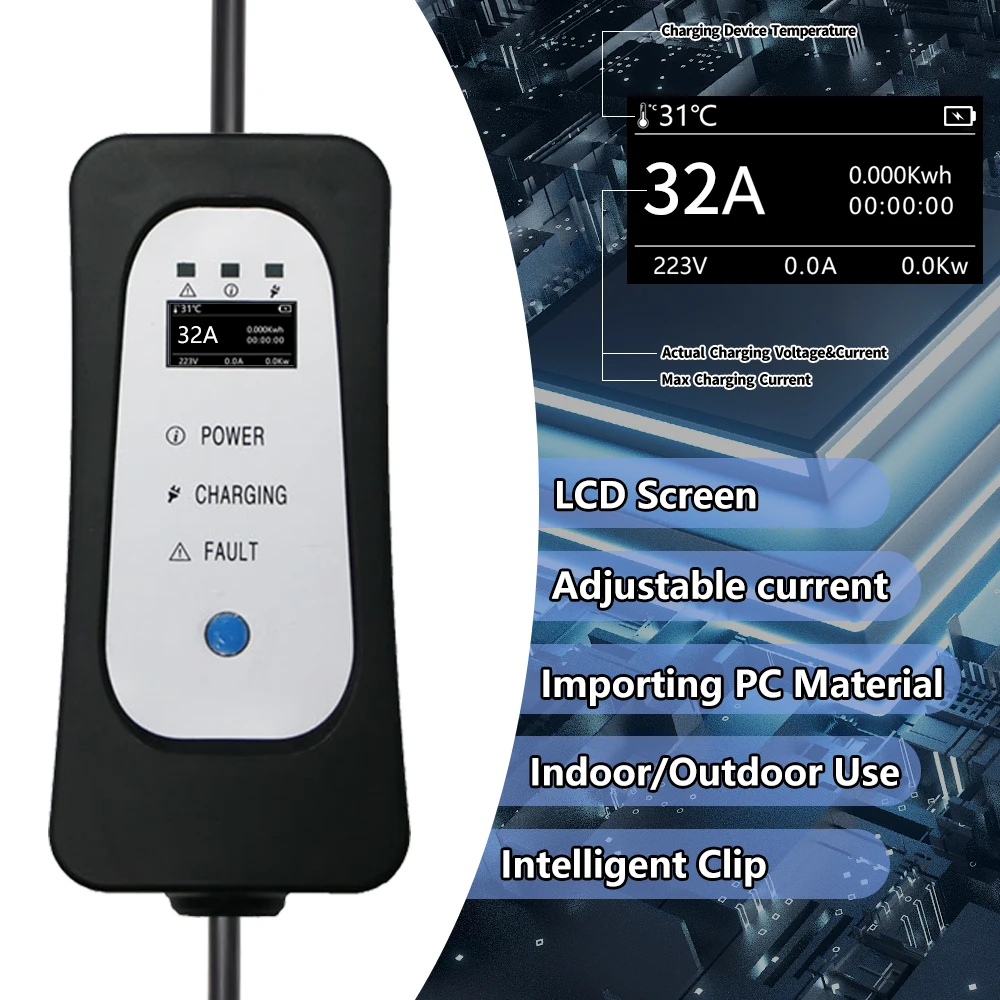 Синяя кнопка-это кнопка регулировки тока. Нажмите синюю кнопку, чтобы изменить ток. Когда вы регулируете ток, SAE J1772 разъем отключен, Вилка питания всегда подключена. Когда вы доберетесь до нужного объема, подключите его и начните зарядку.