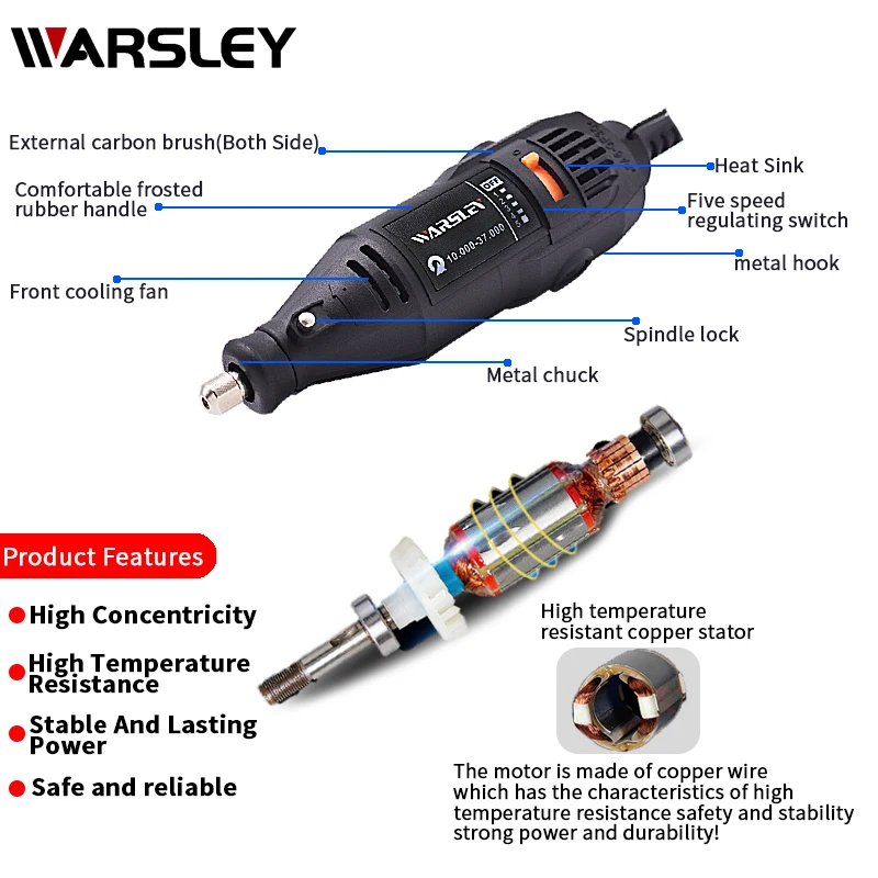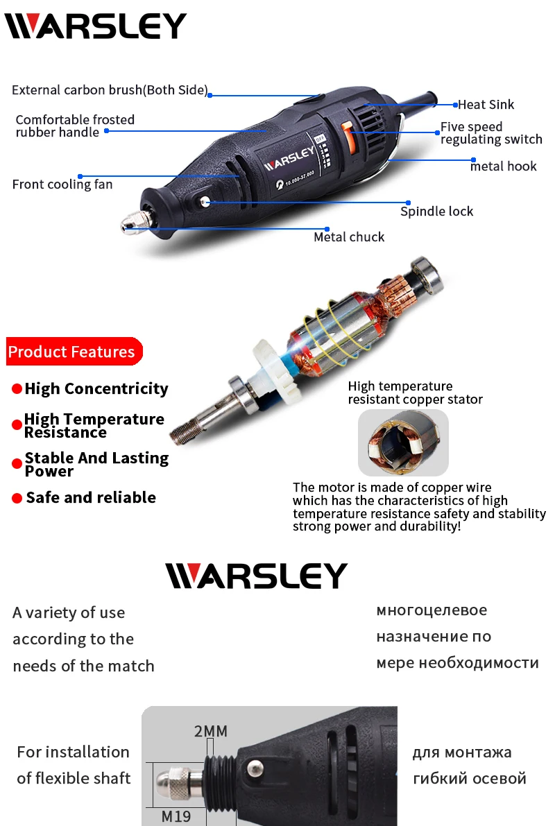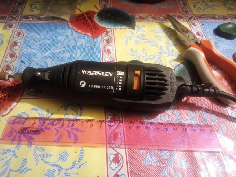 Хороший дремель. Работает отлично. Режет, сверлит, гравирует. Плавная регулировка скорости. Мощность вроде держит. Биения вроде малы. Продавец быстро отправляет, доставка 20 дней в Украину. Но. Квадратный конец троса в удлинителе в цанге не закреплен штифтами с резьбой. Они попросту отсутствуют. Поэтому возможен выход изделия из строя. Их необходимо сделать этим же дремелем, из обычных винтов, срезав шляпку с винта и прорезав прорезь, вкрутить и закрепить трос в цанге. Кроме того все детали классно выглядят на картинке, но это все приходит в навал в мешочке и поэтому пользоваться неудобно, надо их высыпать и выбирать какой нужно пользоваться. Поэтому необходимо докупить кейс для дремеля и деталей к нему. Поэтому только 4 звезды за трос и с оговорками выше я рекомендую данный товар к покупке и использованию, рекомендую продавца тоже. Удачных покупок!