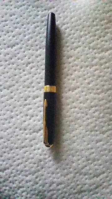 очень хорошая ручка полностью металлическая, черного цвета, матовая с золотыми вставками. очень приятно лежит в руке