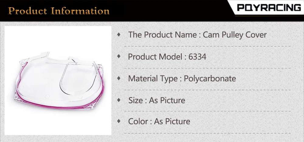 100% гарантия качества протестирована, более отзывчива, дешевле, проще в установке.Прозрачная крышка камеры почти точно дублирует заводскую часть.Высокая термостойкость и устойчивость к коррозии.Последний тренд в изменении автомобиля.Можно проверить, повреждены ли ремни ГРМ.Может обнаруживать любые сломанные ремни из-за утечки масла.Улучшает видимость двигателя.Уменьшить сложность ремонта двигателя.Улучшенный опыт жизнестойкости двигателя.Рекомендуется для использования регулируемого кулачкового шкива.Размеры и материал: