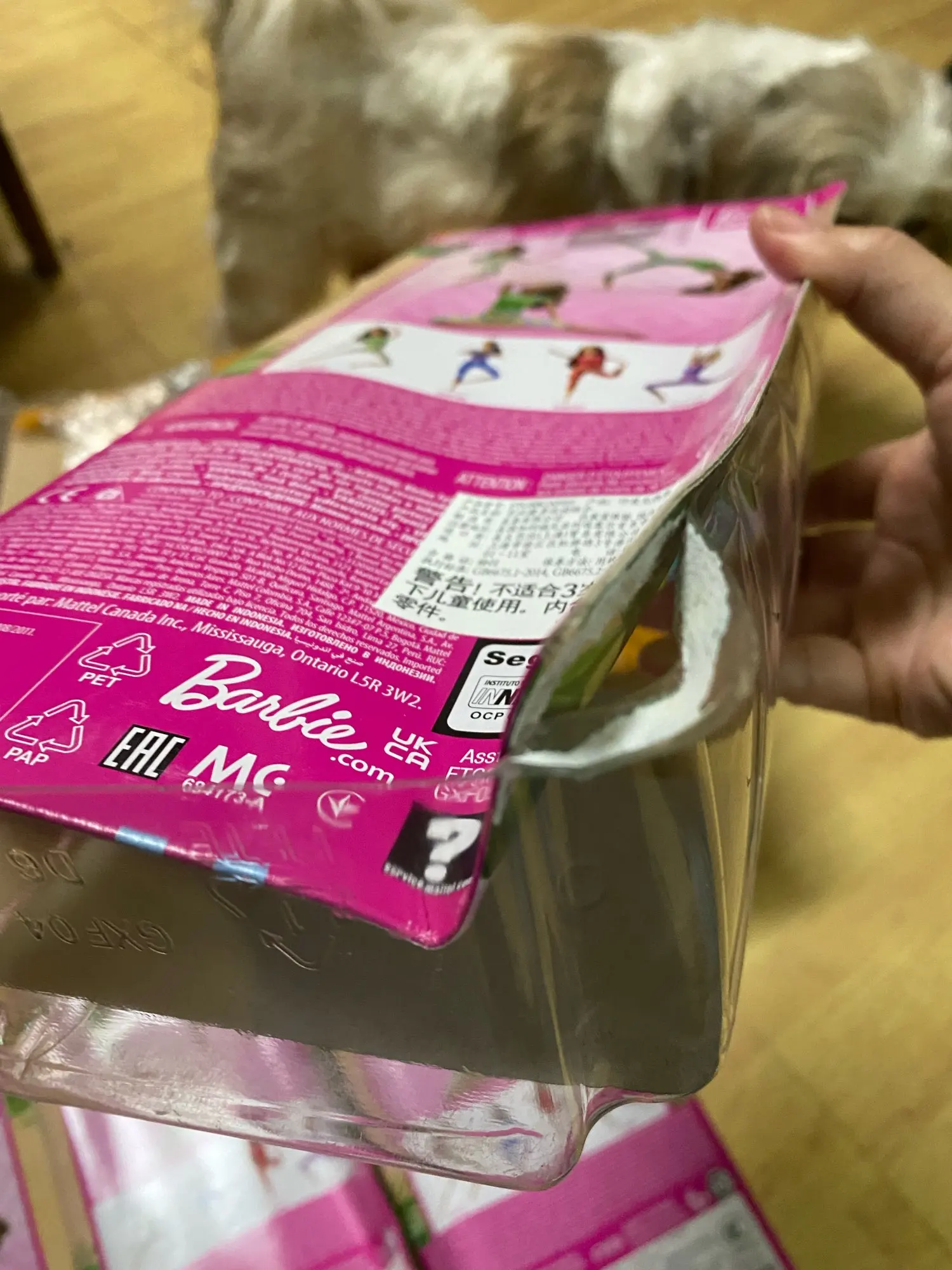Мятая сильно коробка, кукла в отличном состоянии.