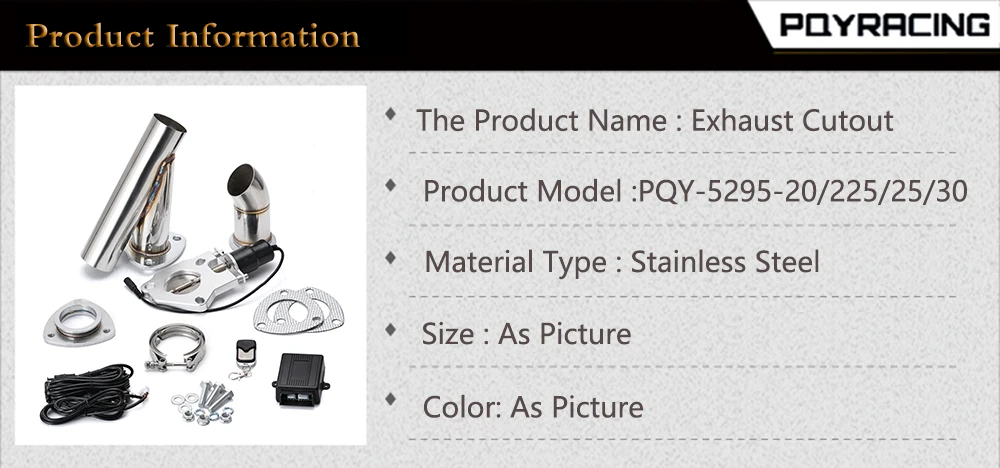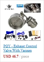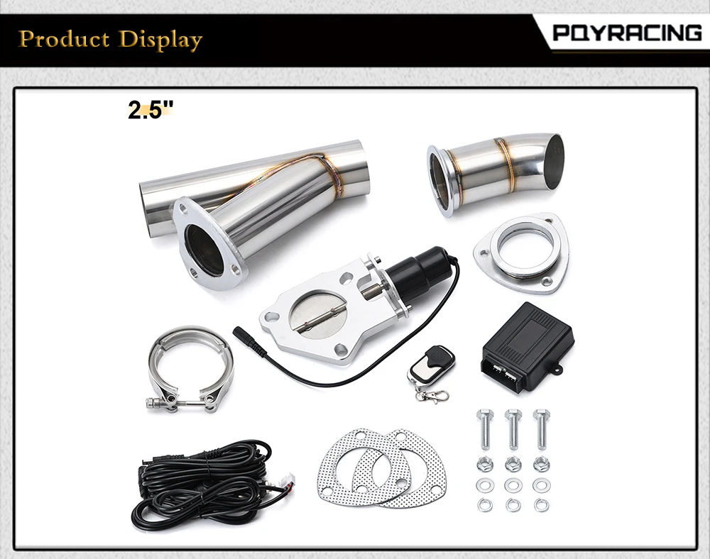 1 x Алюминиевый Электрический Выпускной вырез с ЧПУ. 1 x y-адаптер из нержавеющей стали (11 дюймов в длину) 1 труба из нержавеющей стали 45 градусов. 1 x Жгут проводов. 1 x выключатель питания. 1 пульт дистанционного управления 1 x Приемник 1 х самосвал из нержавеющей стали с прокладкой Все хомуты, прокладки и Hardwares также включены в фотографии. Примечание: