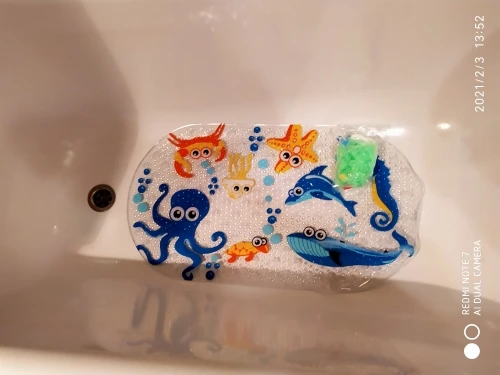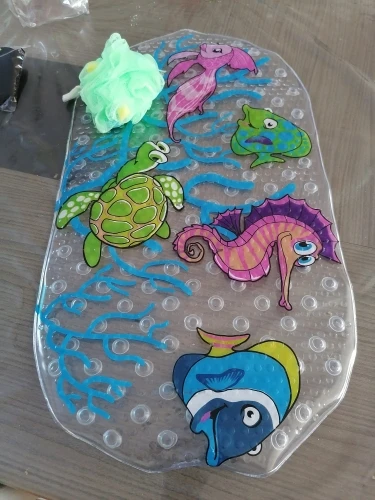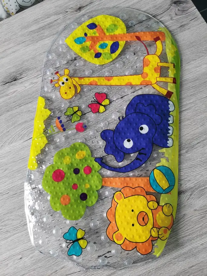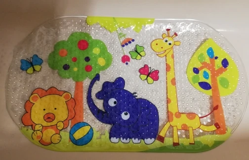 коврик хороший,не скользит. брали ребёнку в ванную для купания,чтоб небыло холодно. картинки яркие
