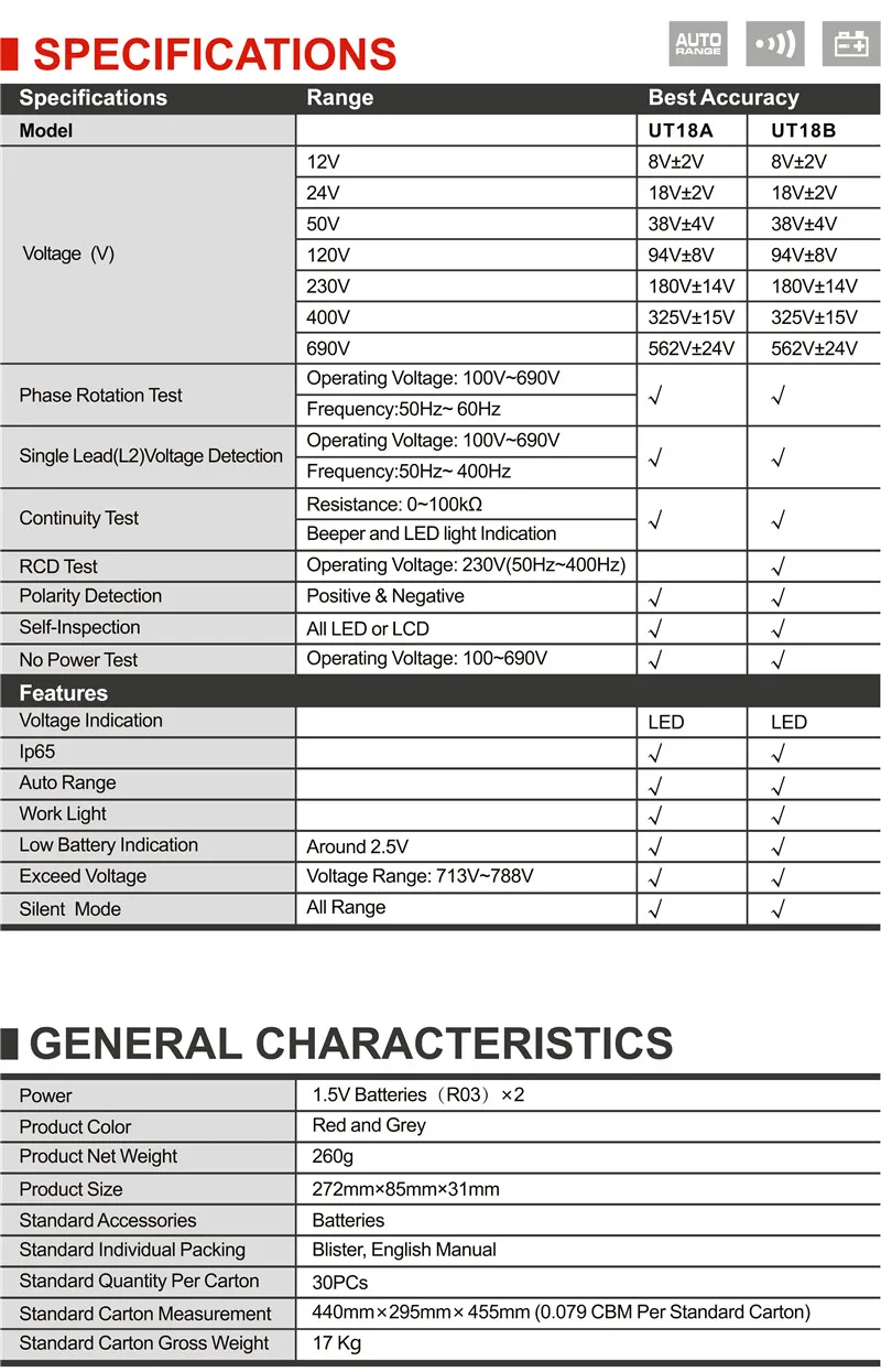 UNI-T UT18AUT18BUT18CUT18D проверки напряжения и целостности цепи; Водонепроницаемый карандаш, тест RCDопределение полярности