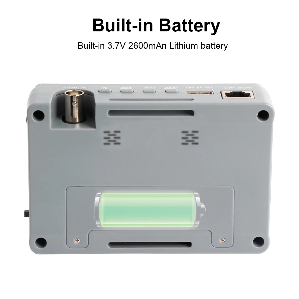 4.IV5-8MP, a,5 дюймов b,HD разрешение экрана 800*480 c, поддержка 8MP AHD + TVI + CVI/CVBS видео тестер d,UTC (HD коаксиальный контроль, BNC коаксиальный Контроль PTZ, но не могу вызвать информацию о меню камеры) и функции RS485 и UTP