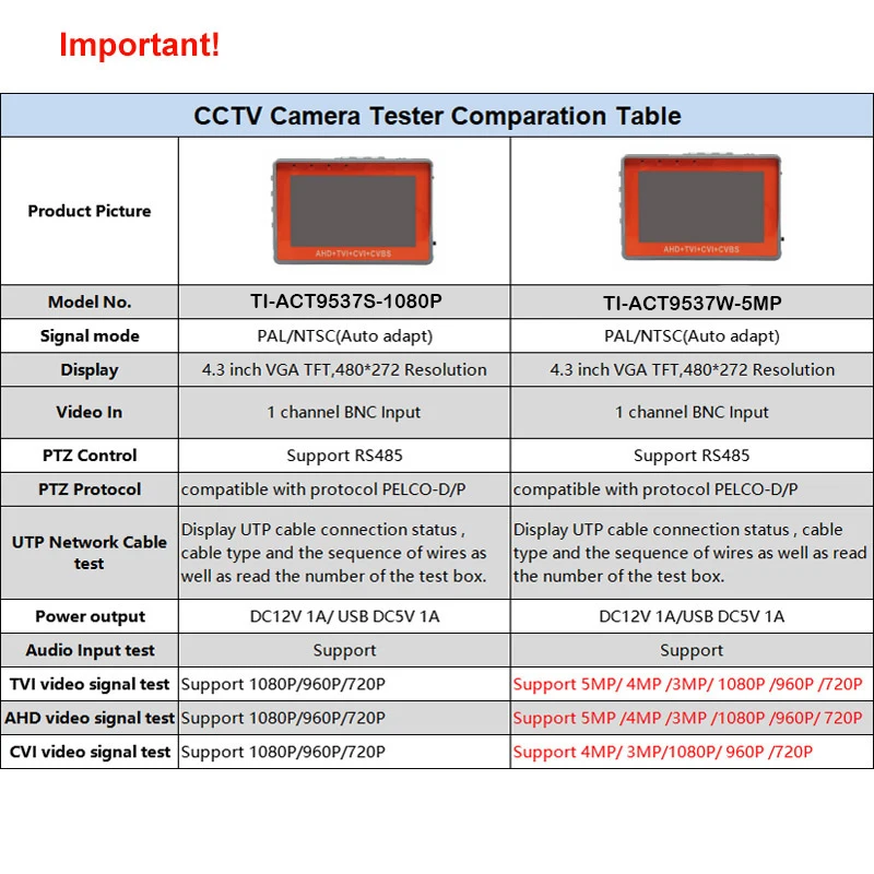 Примечание! Для функций RS485 и UTC камера должна соответствовать обеим функциям и скорости передачи данных камеры, адресному коду, Протокол должен быть таким же, как и тестер. 1. 7A-1080P a, поддержка 4,3 дюйма b,1080p AHD/CVBS видео тест c,PTZ 485 и UTP функция тестера кабеля 2,7 S-1080P a, поддержка 4,3 дюйма b,1080P AHD + CVI + TVI /CVBS видео тест c,PTZ 485 и UTP кабель тестирование функции 3. 7W-5MP , a, поддержка 4,3 дюйма b,5MP AHD + TVI 4MP CVI /CVBS c, тестер кабеля UPT и функция PTZ 485 4.I5V-8MP, a,5 дюймов b,HD разрешение экрана 800*480 c, поддержка 8MP AHD + TVI + CVI/CVBS видео тестер d,UTC (HD коаксиальное управление, BNC коаксиальное Управление PTZ, но нельзя звонить в меню камеры) и RS485 и UTP функции Все Поддерживаемые языки: английский, итальянский, русский, немецкий, испанский, португальский, Энгельс, китайский