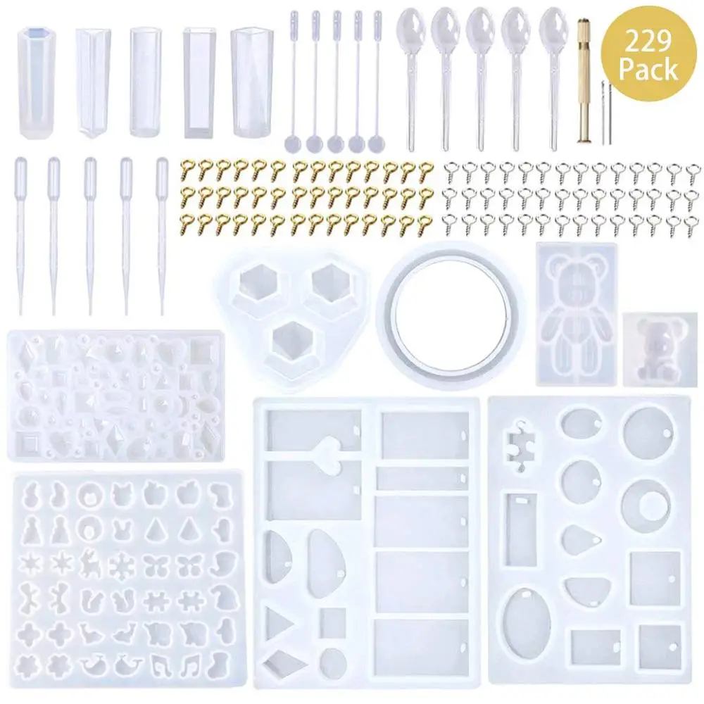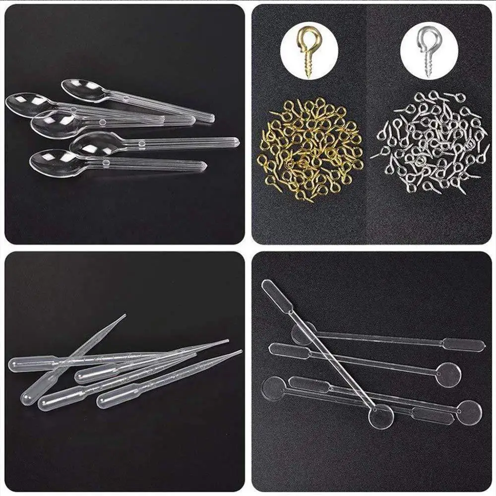 9 x формы для изготовления ювелирных изделий 100 x золотые винтовые шпильки для глаз 100 x серебряных винтовых штифтов для глаз 5 x Пластик мешалки 5 x Пластик ложки 5 x Пластик капельницы 1 х ручная дрель (включая 4 шт. сверла),