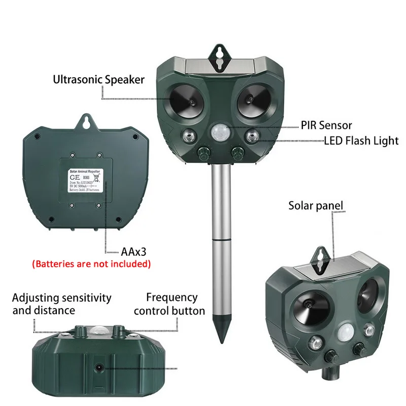 Этот товар-ультразвуковой отпугиватель на солнечных батареях. Он будет излучать ультразвук для отражения животных, когда он обнаруживает движение спереди.