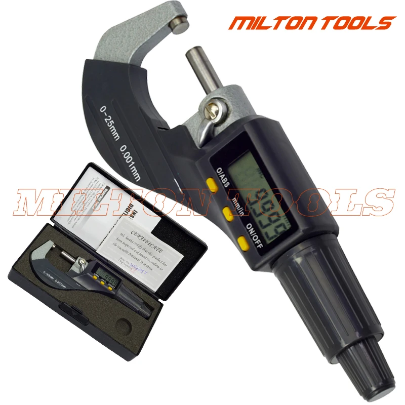2 кнопки электронный цифровой микрометр Rev.: 0,001 мм/0,00005" Шпиндель без вращения. С атласно-хромовой шкалой Высококачественный Теплоизоляционный захват. Измерительные поверхности изготовлены из карбида вольфрама. Храповик постоянной силы на наперсток. Упакован в пластиковый чехол. Мощность: CR2032, 1 аккумулятор внутри микрометра (Батарея не включена для воздушной доставки из-за почтовых правил)