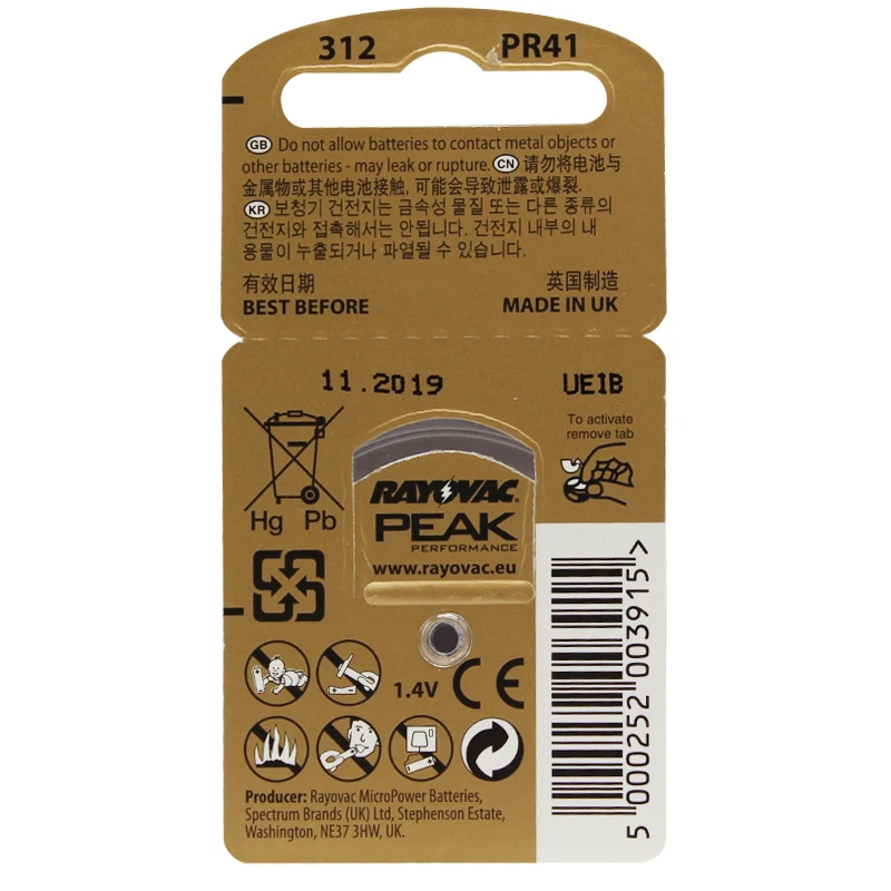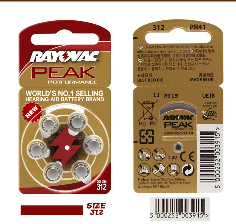 Высокопроизводительные батареи для слухового аппарата Rayovac PEAK, 60 шт. Аккумулятор из цинка Air 312A312PR41 для слуховых аппаратов BTE. Бесплатная доставка!