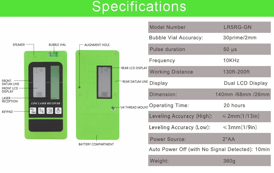 ⭐【Большое окно приема и двойной ЖК-дисплей 】-большое окно приема 2 дюймов и оптические и акустические сигналы помогают быстро и точно найти лазерную плоскость. Двойные ЖК-дисплеи для удобного визуального отображения с обеих сторон приемника. Задний светильник LCD обеспечивает четкий вид даже в условиях низкого уровня светильник. Отрегулируйте высоту до тех пор, пока горизонтальная линия передачи данных и Стрелка не исчезнут на ЖК-дисплее. ⭐【Точные оптические и акустические сигналы 】-этот лазерный приемник оснащен удобным интерфейсом и является умным в своем простом дизайне. Оптические и акустические сигналы помогают быстро и точно найти лазерную плоскость. Светодиодный индикатор обеспечивает четкий и точный сигнал. Звуковой сигнал будет напоминать вам, когда вы найдете цель. ⭐【Долгий Срок службы батареи и хомут 】-приемник поставляется с 2 батареями AA, обеспечивая вам около 20 рабочих часов. Существует также функция автоматического отключения, которая позволяет выключить устройство примерно через 10 минут холостого хода, чтобы продлить срок службы батареи. Прикрепленный Сверхмощный зажим позволяет легко установить детектор на стержень или другую точку назначения.