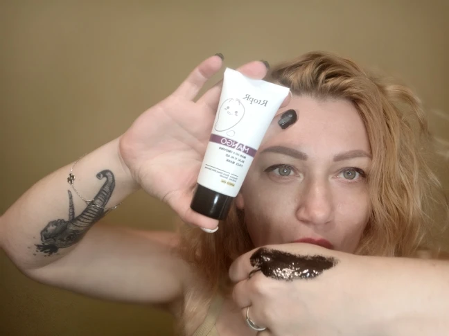 Черная маска - пленка от черных точек. Доставка 3 недели, трек отслеживался Тюбик упакован в слюду, крышка запечатанаПользовалась пока пару раз. Первый раз нанесла слишком толстый слой и пришлось смывать водой. Второй раз уже нанесла тонкий. Держать нужно 15-20 минут. Кожа после него действительно более очищенная, можно сказать блестит от чистоты. Черные точки удаляются, но не все.