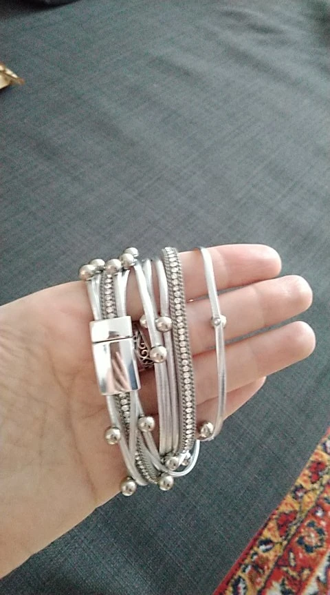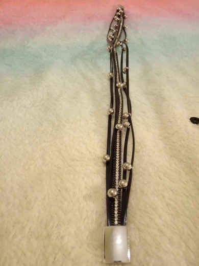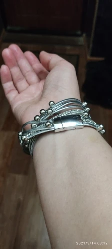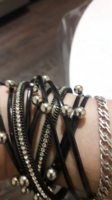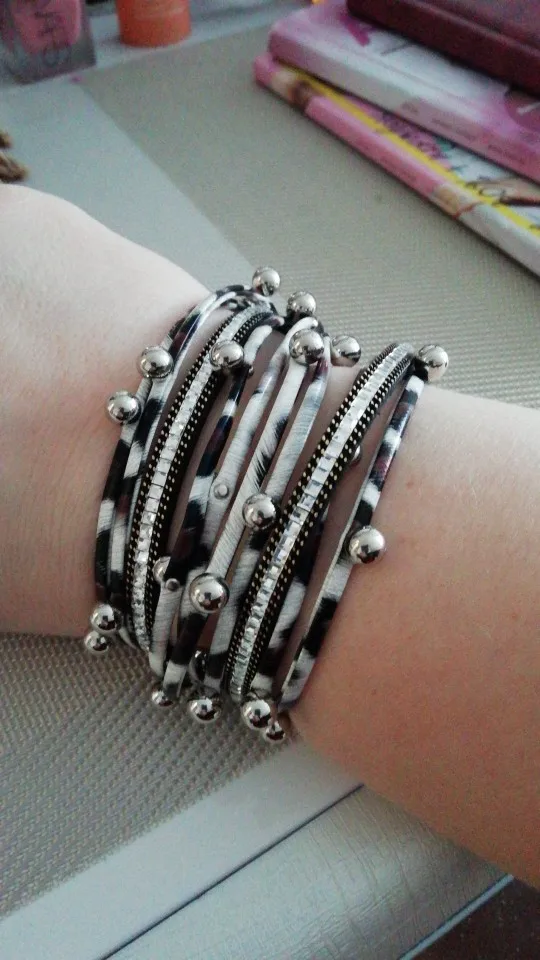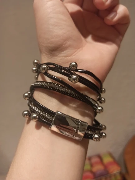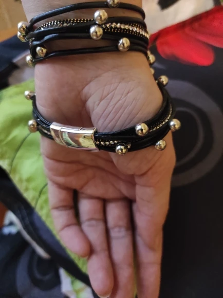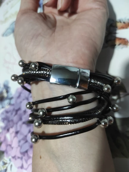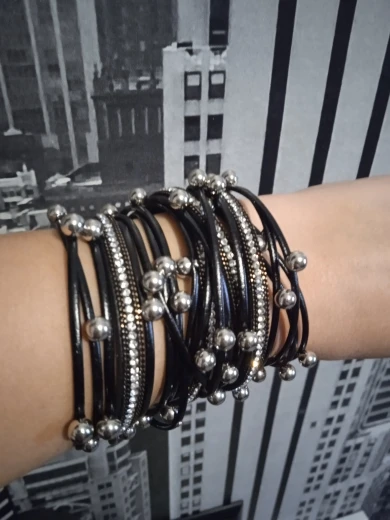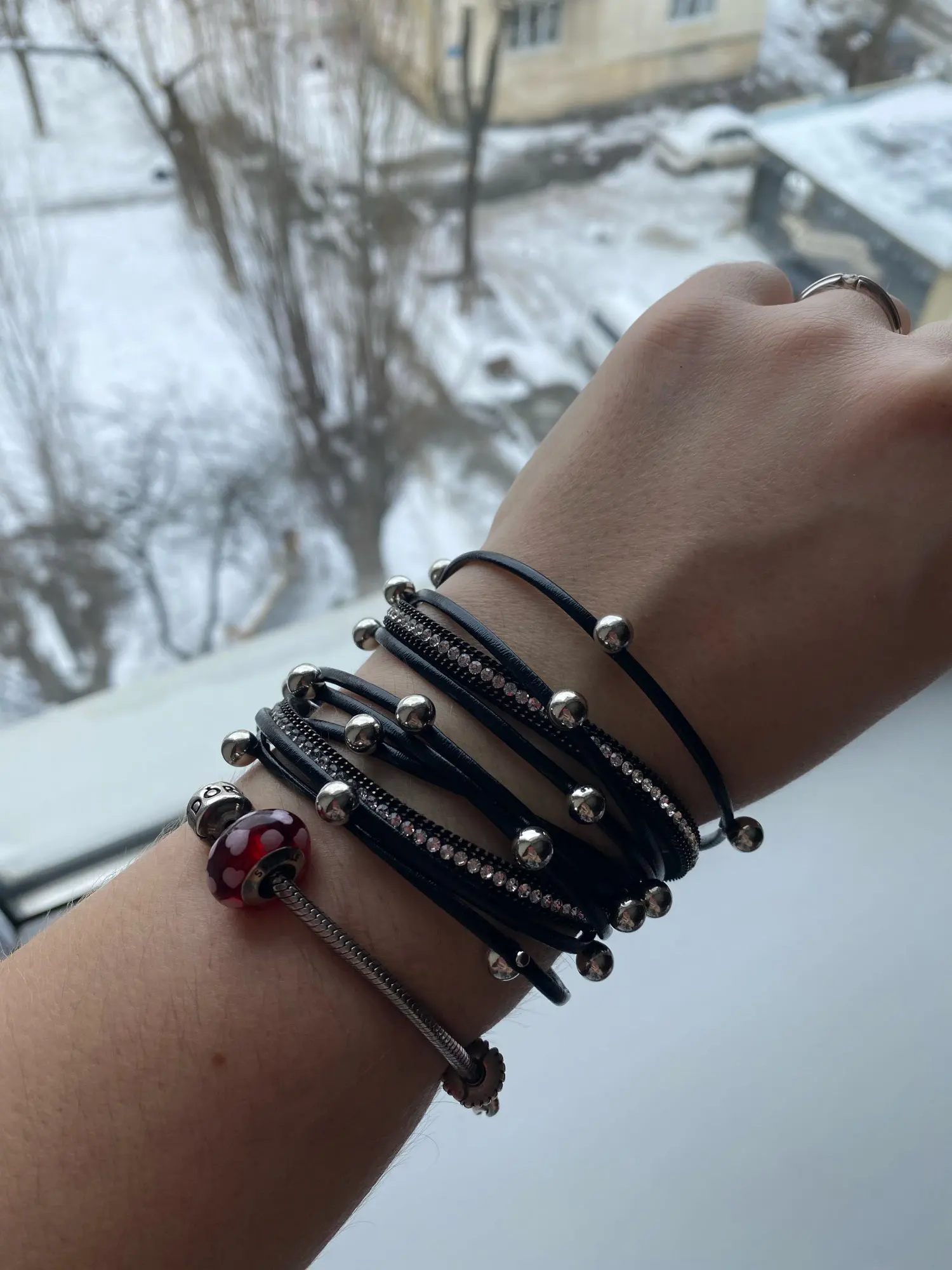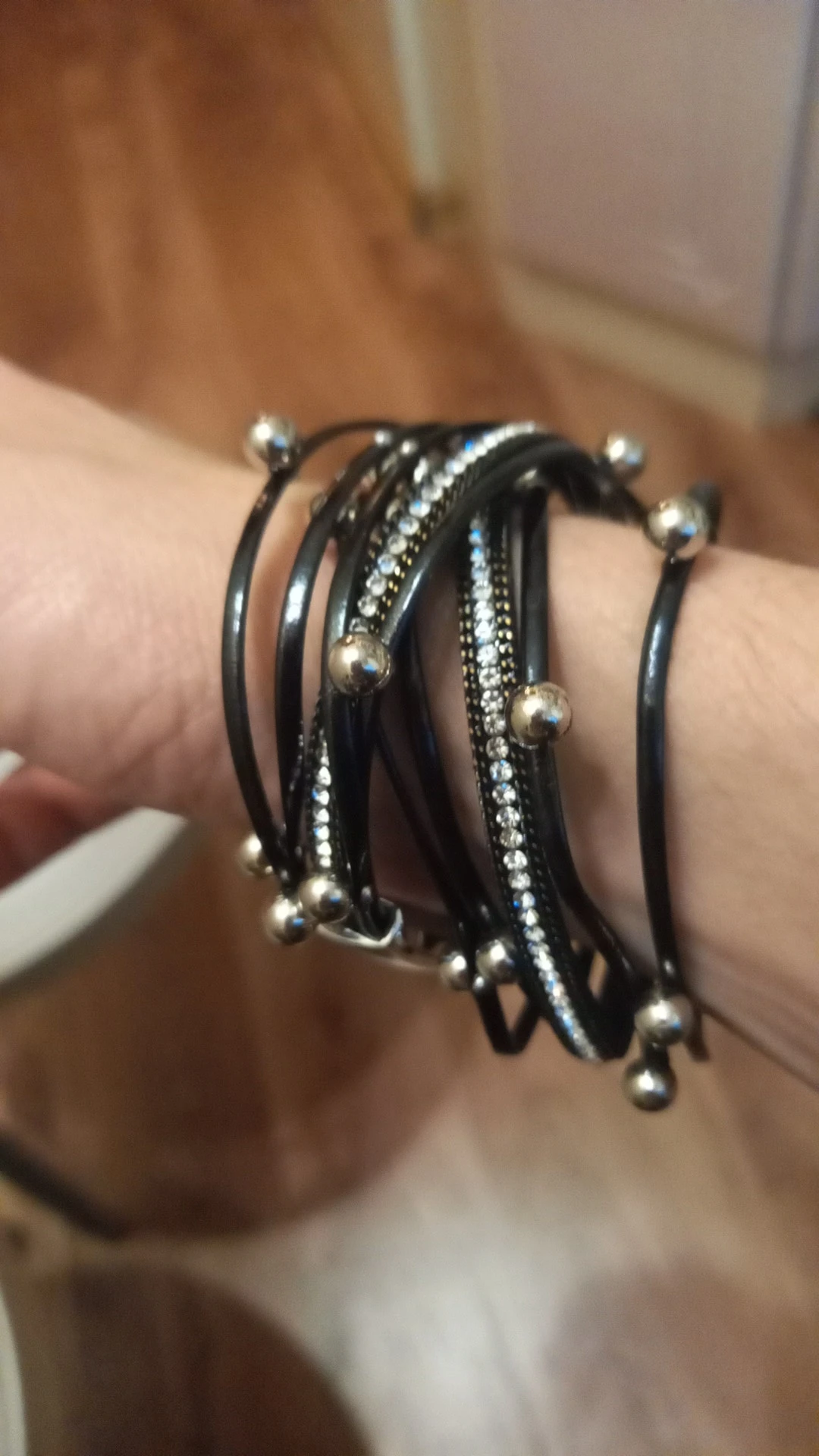 Симпатичный браслет, смотрится интересно и достаточно стильно. Не кожа, но качество хорошее. Стразики - стекло, закреплены ровно, все на месте, блестящие . Металлические бусинки, правда, все в мелких щербинках, но издалека этого не видно. Магнитный замочек держит хорошо. Ширина замочка 14 мм, длина 39 см. На мое запястье 17 см сел в самый раз! Постороннего запаха нет. Заказом довольна