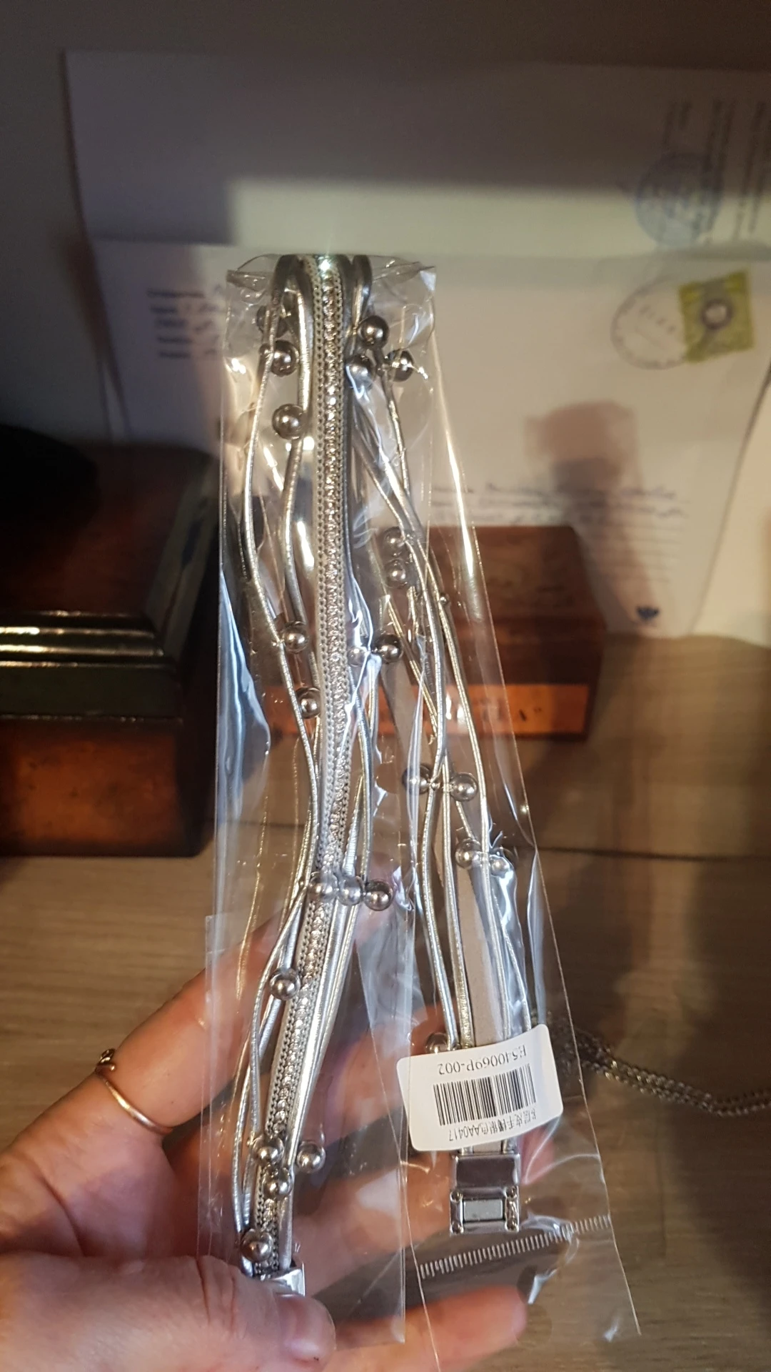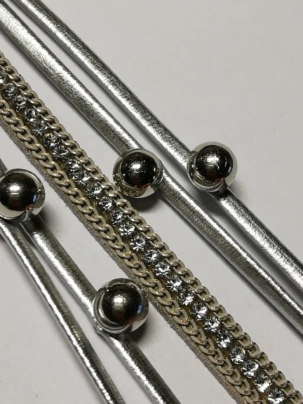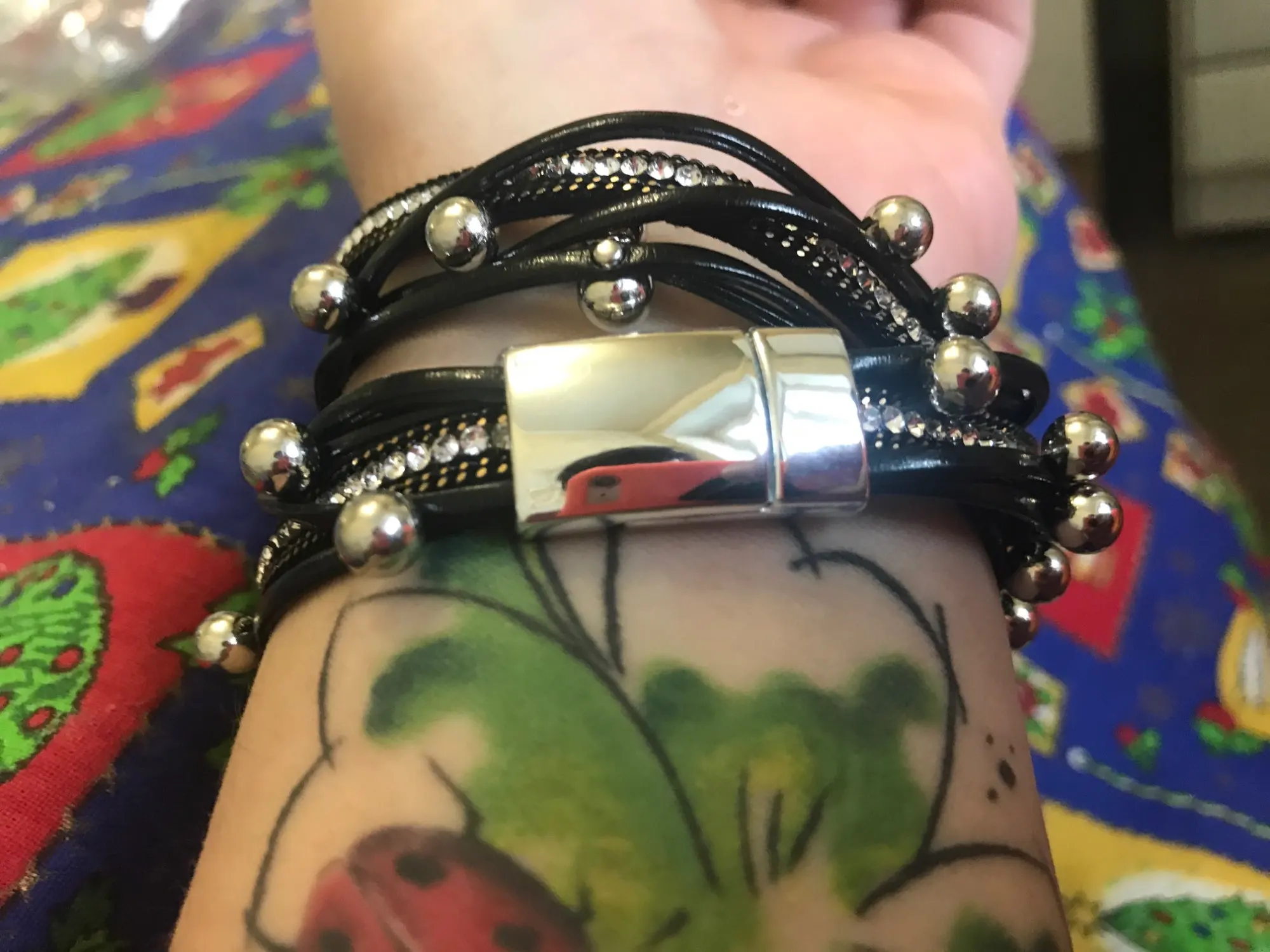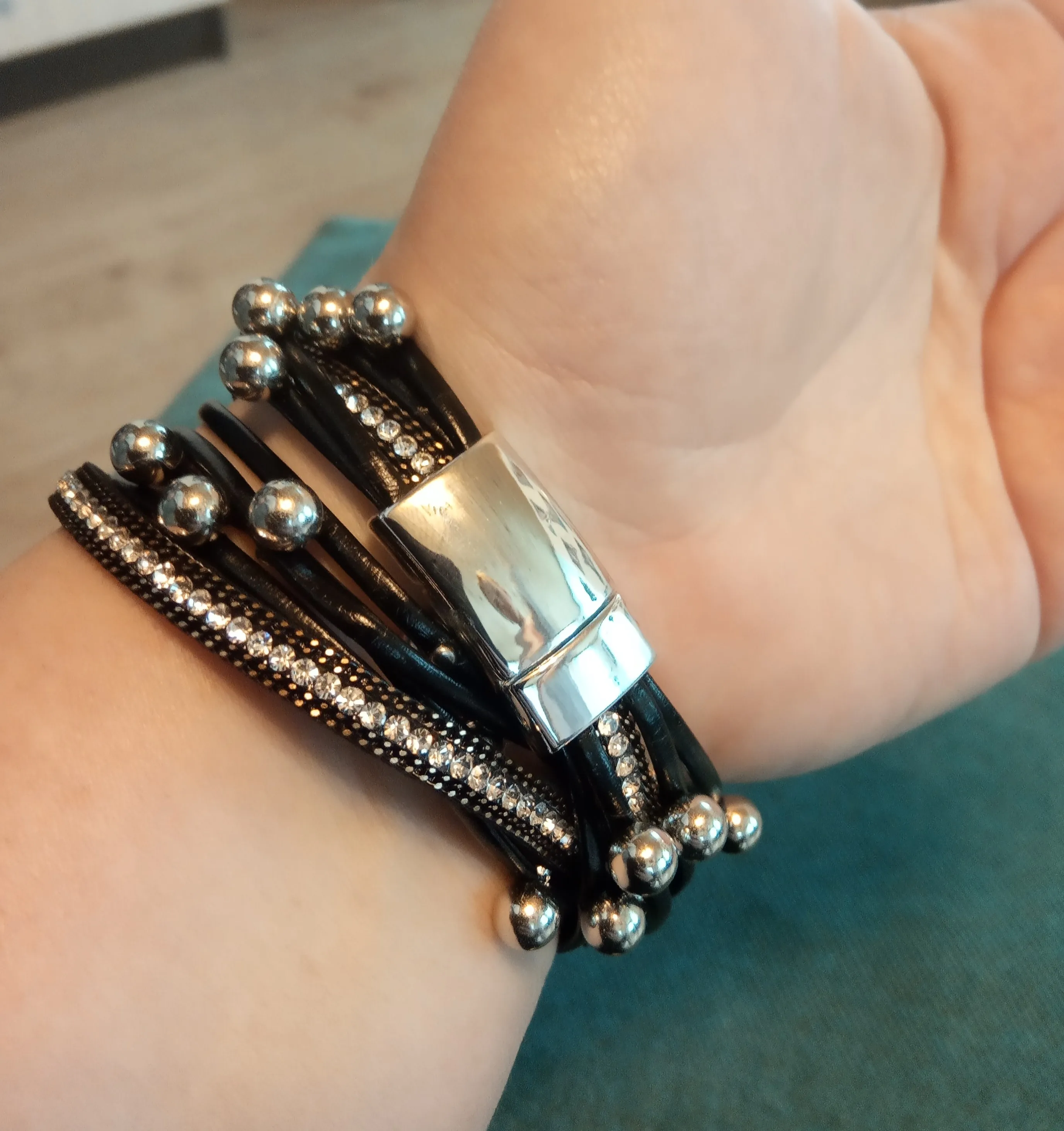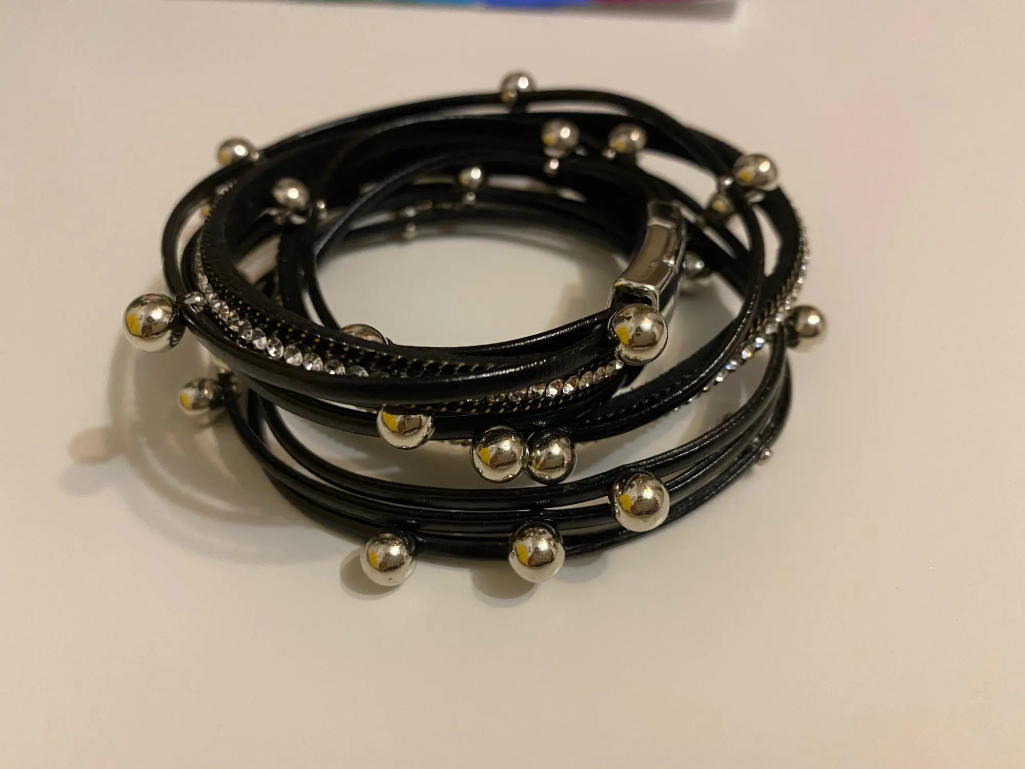 Симпатичный браслет, смотрится интересно и достаточно стильно. Не кожа, но качество хорошее. Стразики - стекло, закреплены ровно, все на месте, блестящие . Металлические бусинки, правда, все в мелких щербинках, но издалека этого не видно. Магнитный замочек держит хорошо. Ширина замочка 14 мм, длина 39 см. На мое запястье 17 см сел в самый раз! Постороннего запаха нет. Заказом довольна