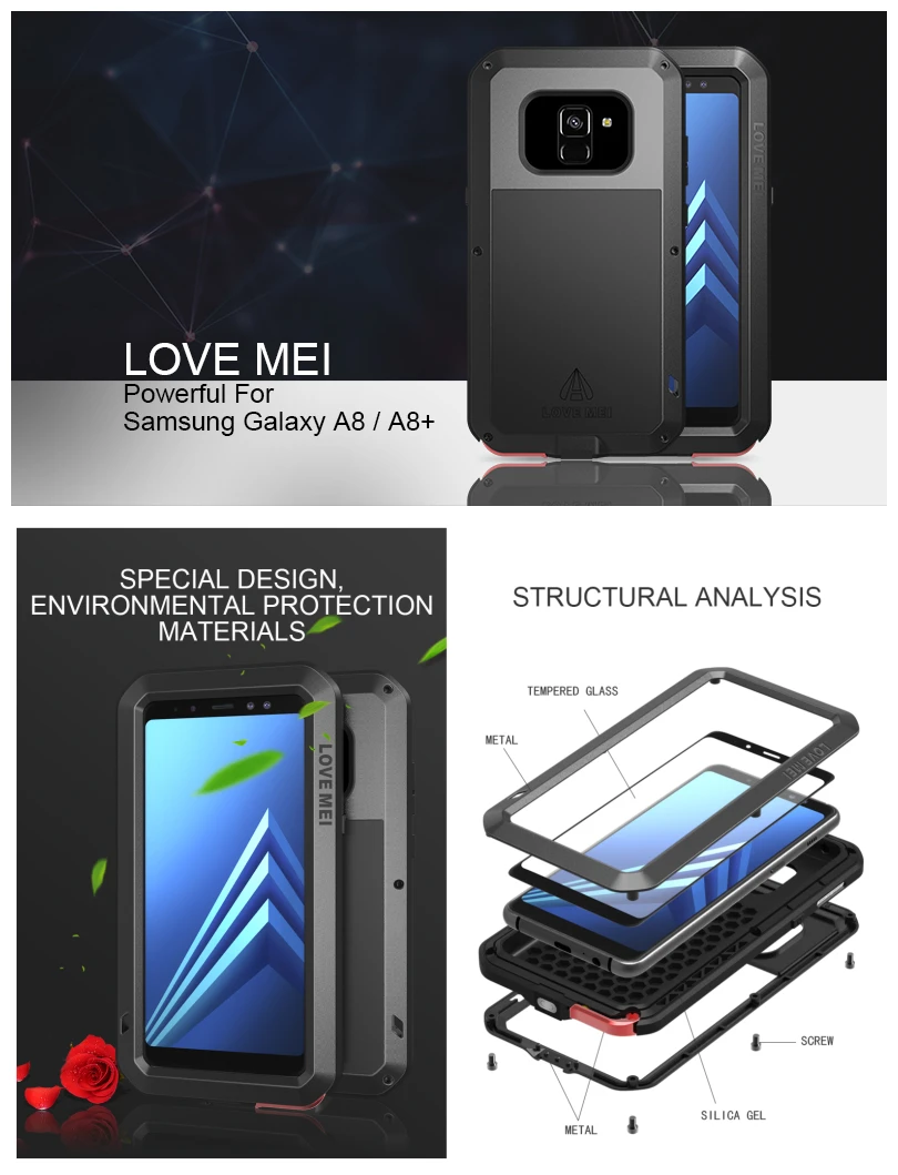 Алюминиевый металлический защитный чехол LOVE MEI с защитным стеклом для Samsung A8 A8 + 2018, мощная Водонепроницаемая Броня