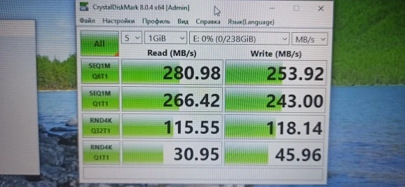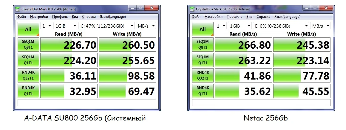 Пришло быстро, покупкой доволен. Брал 240 для ноутбука, поставил туда систему, а старый hdd в качестве накопителя. В буке оказалось 2 винта, неожиданно, думал сначала поставить вместо двд рома. Тест работы диска показал огромный прирост, что видно на фото.