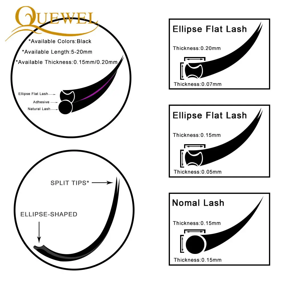 Quewel, плоские ресницы для профессионалов, эллипс, плоская ресница, разделенный кончик, профессиональный мягкий шелк, Quewel, плоские Ресницы CD Curl