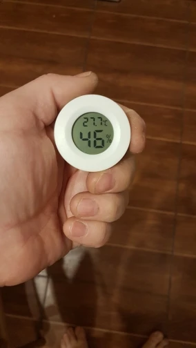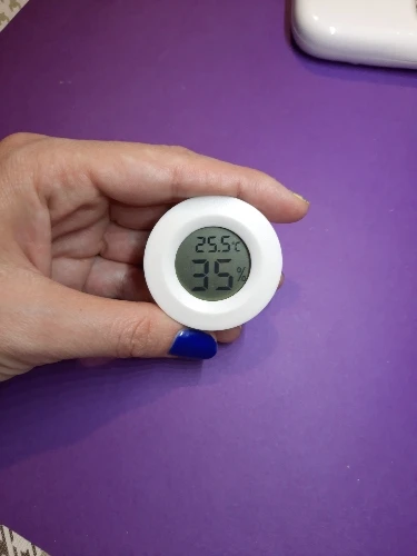 Доставка быстрая. Сам термометр оказался очень маленький, размером со спичечный коробк. Измеряет почти точно, погрешность со ртутным 0.1-0.5°, а вот влажность довольно точно, так что гигомерт тут лучше термометра. Работает от батарейки (типа "таблетка") AG13