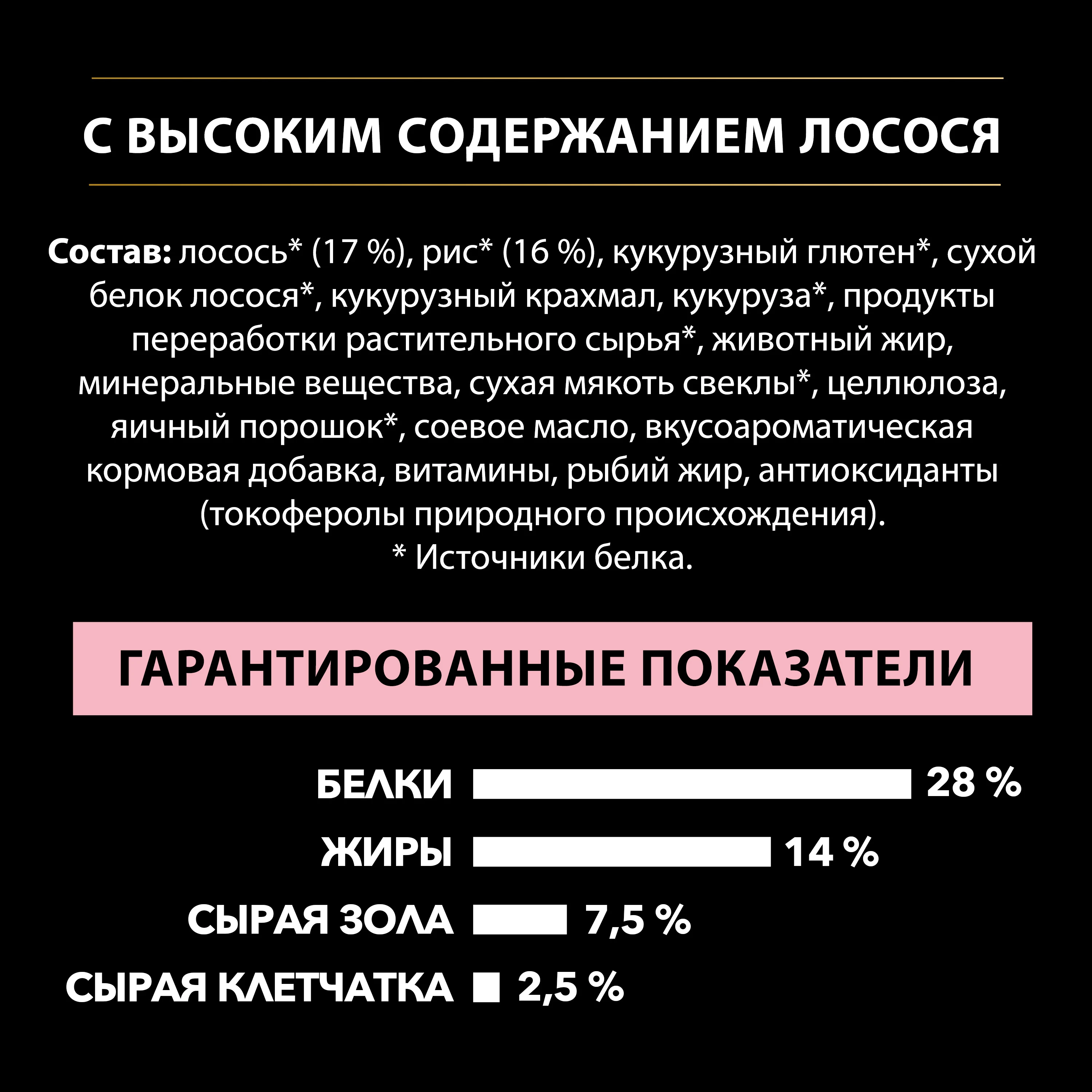 Состав: Лосось* (17%), рис* (16%), кукурузный глютен*, сухой белок лосося*, кукурузный крахмал, кукуруза*, продукты переработки растительного сырья*, животный жир, минеральные вещества, сухая мякоть свеклы*, целлюлоза, яичный порошок*, соевое масло, вкусоароматическая кормовая добавка, витамины, рыбий жир, антиоксиданты (токоферолы природного происхождения). * Источники белка.