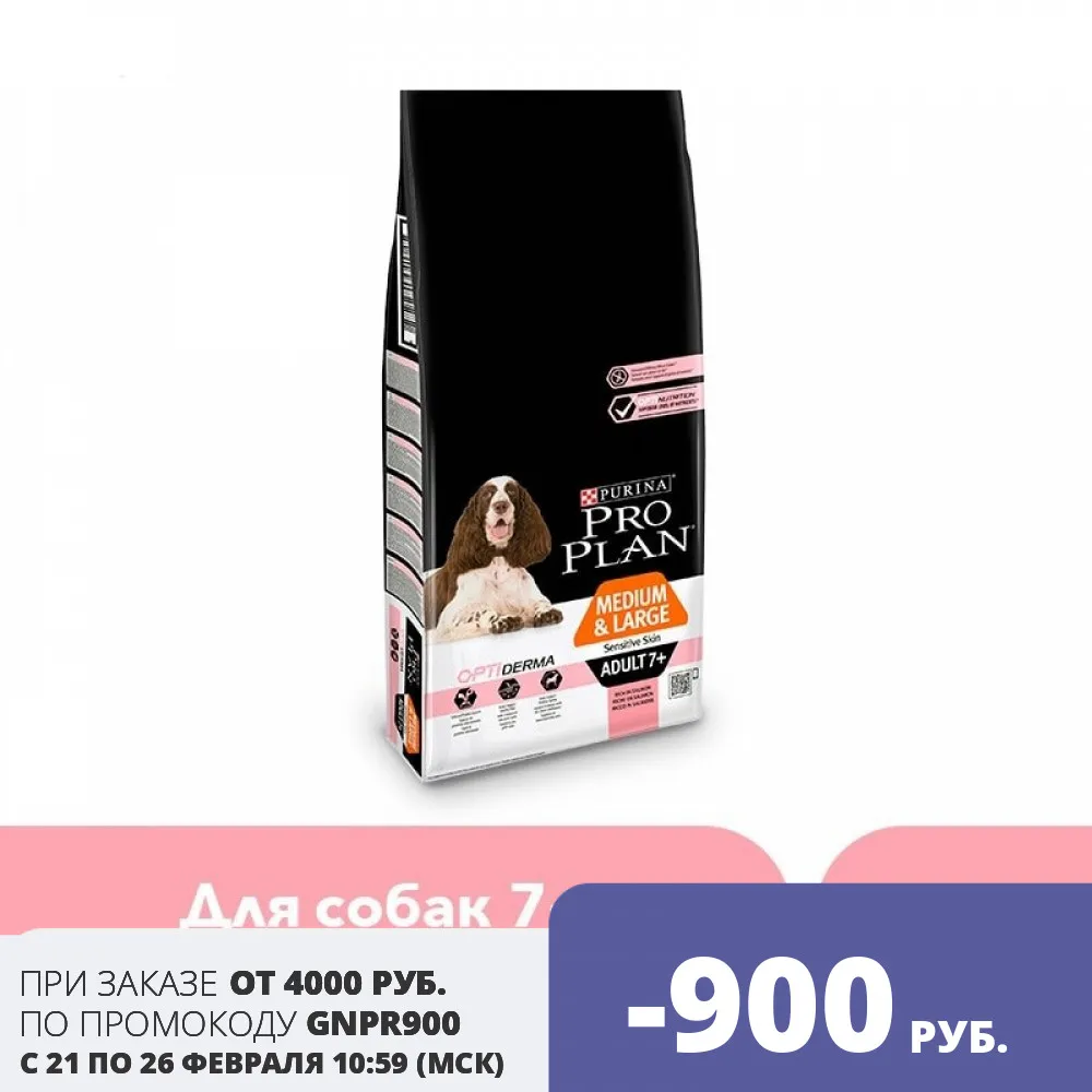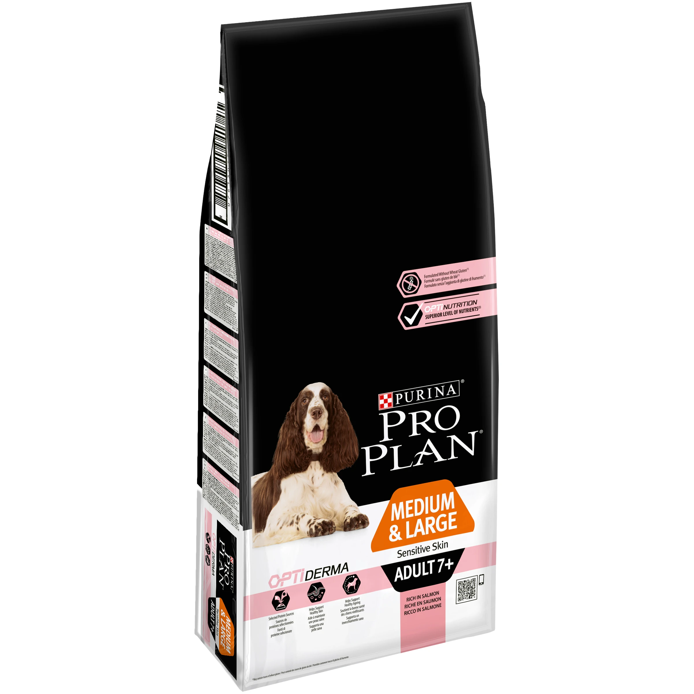 Сухой корм Pro Plan для взрослых собак старше 7 лет средних и крупных пород с чувствительной кожей с комплексом OPTIDERMA с лососем и рисом, 14 кг.