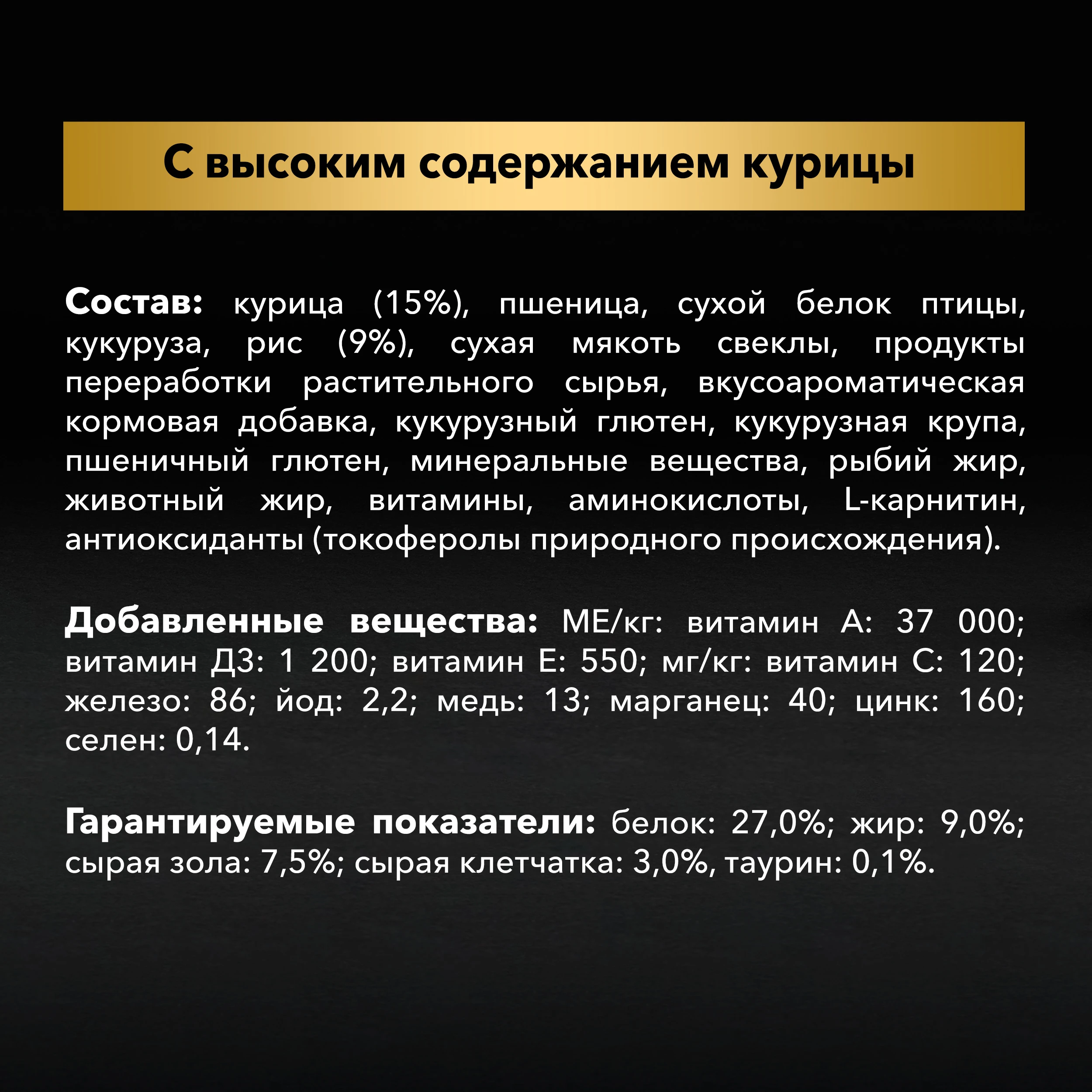 Состав: Курица (15%), пшеница, сухой белок птицы, кукуруза, рис (9%), сухая мякоть свеклы, продукты переработки растительного сырья, вкусоароматическая кормовая добавка, кукурузный глютен, кукурузная крупа, пшеничный глютен, минеральные вещества, рыбий жир, животный жир, витамины, аминокислоты, L-карнитин, антиоксиданты (токоферолы природного происхождения).