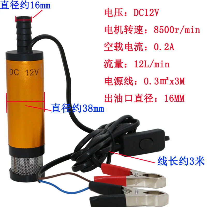 Производительность 12V Портативный Погружной дизельный заправочный насос работает стабильно. Полностью герметичное устройство, изолированное. Этот товар маломерит. Легкий, легко устанавливается и переносится. Электрический провод длиной 3 метра, диаметр порта насоса-16 мм, а труба-самоподобранная.