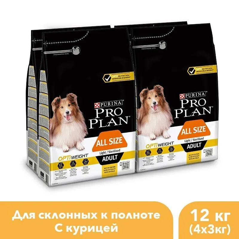Сухой корм Pro Plan для склонных к избыточному весу иили стерилизованных взрослых собак всех пород с комплексом OPTIWEIGHT с курицей и рисом, 12 кг.
