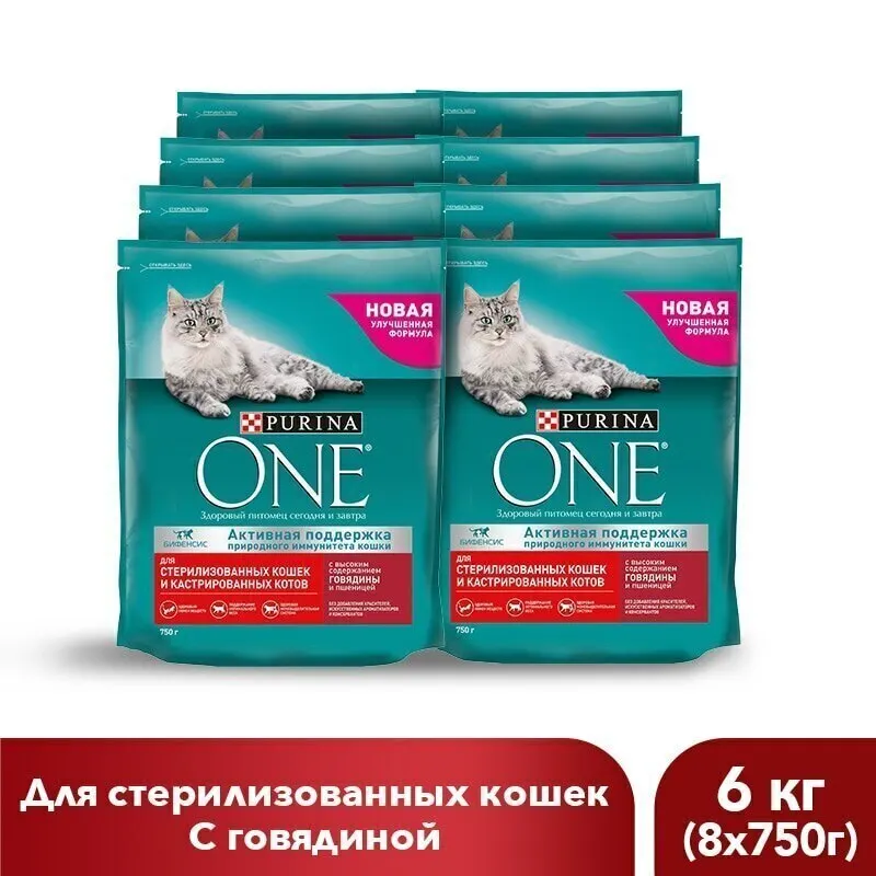 Сухой корм Purina ONE для стерилизованных кошек и котов с говядиной и пшеницей, 6 кг.