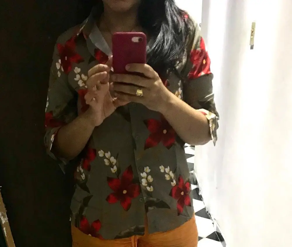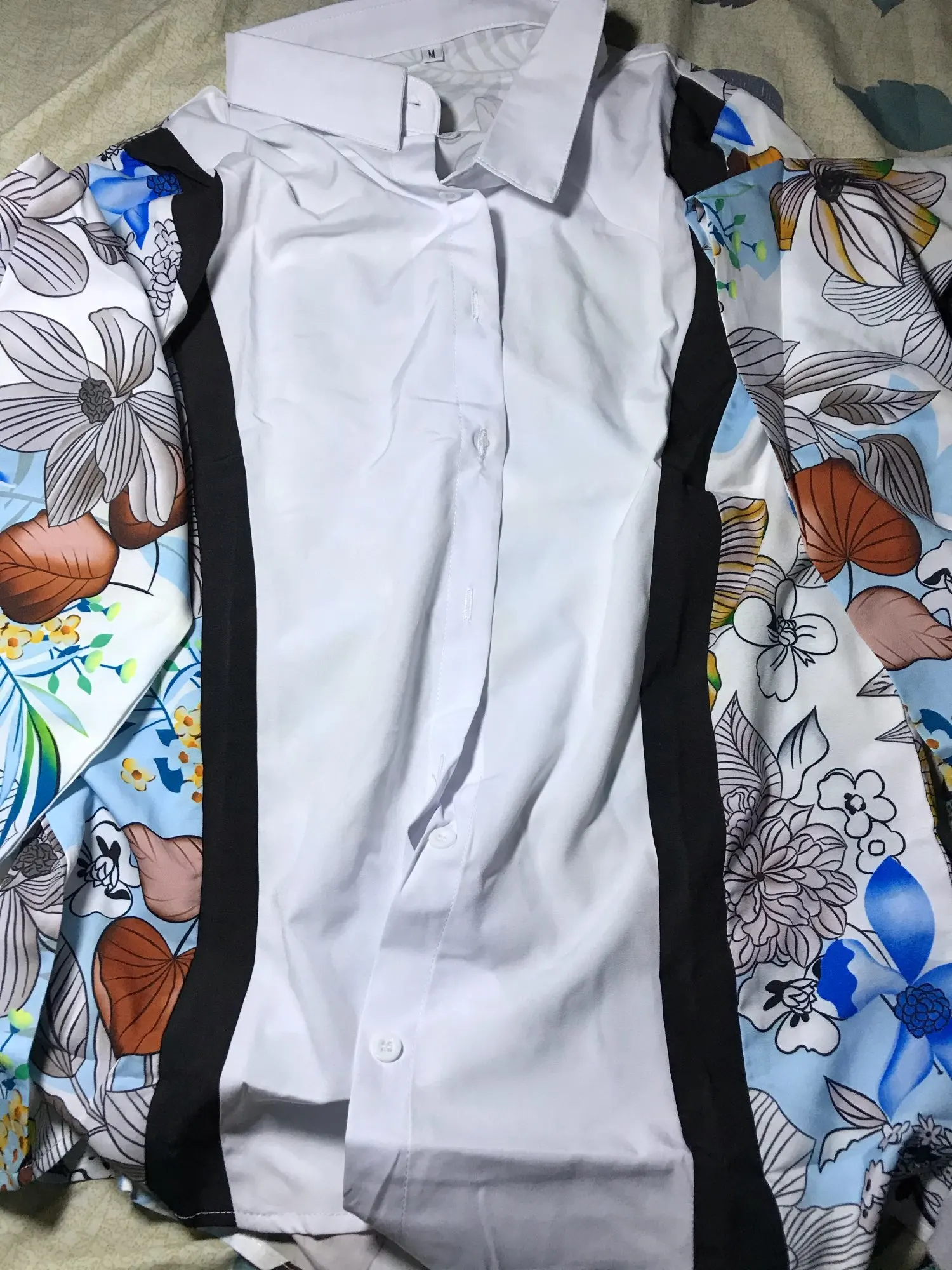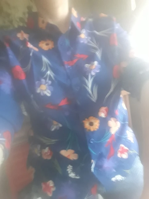 Взяла рубашку голубого цвета. На самом деле она синее. Цветочки крупнее, чем я думала. Швы аккуратные. Посмотрю с чем буду носить.