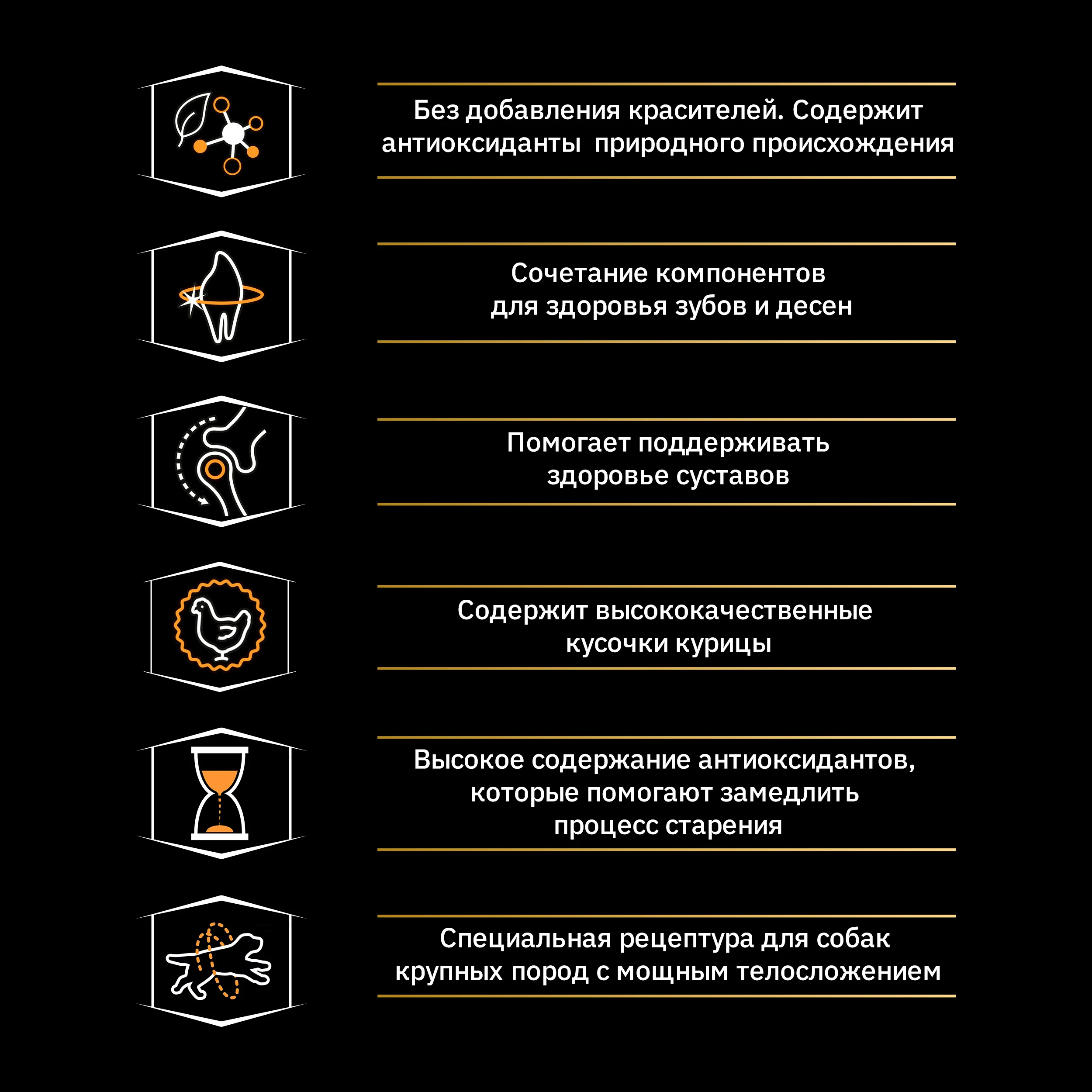 Особое сочетание компонентов для здоровья зубов и десен Сочетание основных питательных веществ, которое помогает поддерживать здоровье суставов вашей собаки при активном образе жизни Высокое содержание антиоксидантов, которые помогают замедлять процессы старения Специальная рецептура для собак крупных пород с мощным телосложением Содержит кусочки высококачественного куриного мясаРекомендации по кормлению: Используйте таблицу для определения суточной нормы кормления вашей собаки. Указанные нормы рекомендованы для поддержания собаки в оптимальной физической форме. Меняйте суточную норму кормления в зависимости от уровня активности собаки, ее физических особенностей и индивидуальных потребностей. Следите, чтобы у собаки всегда была чистая, свежая питьевая вода. Для контроля здоровья вашей собаки обращайтесь в ветеринарную клинику на регулярной основе.