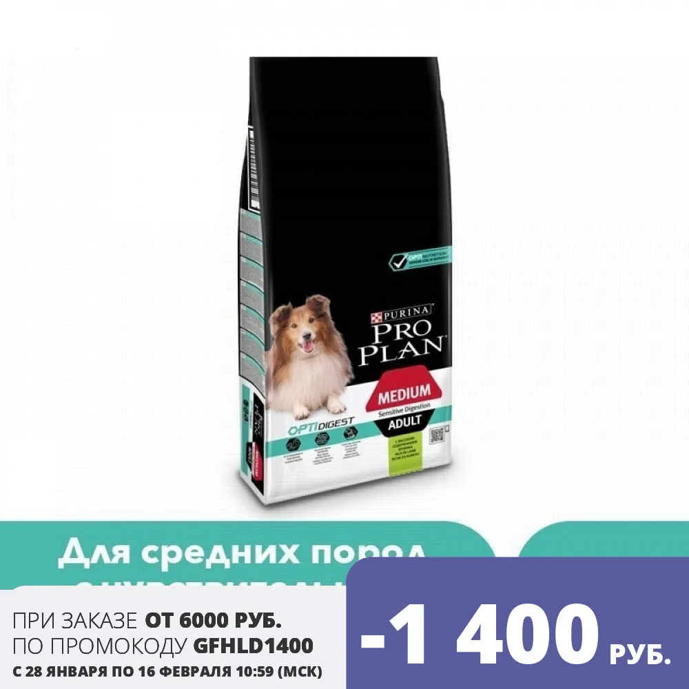 Pro Plan корм для собак средних пород с чувствительным пищеварением, ягненок и рис, 14 кг.