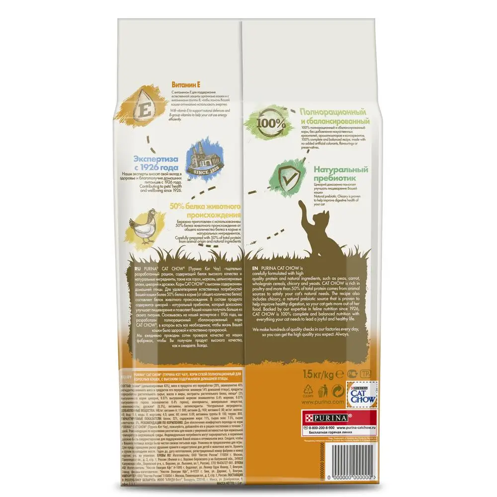 Ваша кошка — уникальное создание. Чтобы она продолжала радовать вас, Purina создала корм Cat Chow® - корм с качественным белком и натуральными ингредиентами (петрушка, шпинат, морковь, цельные зерна злаков, цикорий и дрожжи). Он отличается высоким содержанием домашней птицы и включает Naturium® - особое сочетание волокон из натуральных источников, а также источник натурального пребиотика, который поддерживает здоровое пищеварение кошки. Это позволяет ей питаться с большей пользой. Основываясь на нашей экспертизе с 1926 года, мы разработали полнорационный, сбалансированный корм Purina® Cat Chow®, в котором есть все необходимое, чтобы жизнь вашей кошки была здоровой и естественно прекрасной.