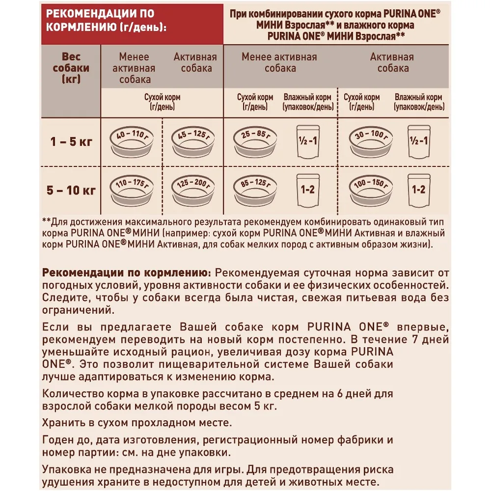 Обогащен белком высокого качества и углеводами для поддержания активного образа жизни. Поддержание крепкой иммунной системы благодаря особому сочетанию антиоксидантов и белка высокого качества. Вкусное сочетание хрустящих крокетов и мягких кусочков. Поддержание здоровой кожи и блестящей шерсти благодаря балансу питательных веществ. Легкая усвояемость благодаря ингредиентам высокого качества.Рекомендации по кормлению: Рекомендуемая суточная норма зависит от погодных условий, уровня активности собаки и ее физических особенностей. Следите, чтобы у собаки всегда была чистая, свежая питьевая вода без ограничений. Если вы предлагаете Вашей собаке корм PURINA ONE® впервые, рекомендуем переводить на новый корм постепенно. В течение 7 дней уменьшайте исходный рацион, увеличивая дозу корма PURINA ONE®. Это позволит пищеварительной системе Вашей собаки лучше адаптироваться к изменению корма. Количество корма в упаковке рассчитано в среднем на 6 дней для взрослой собаки мелкой породы весом 5 кг.