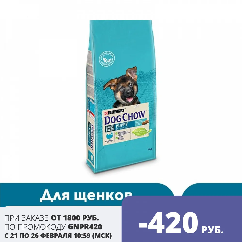 Сухой корм Dog Chow для щенков крупных пород до 2 лет с индейкой, 14 кг