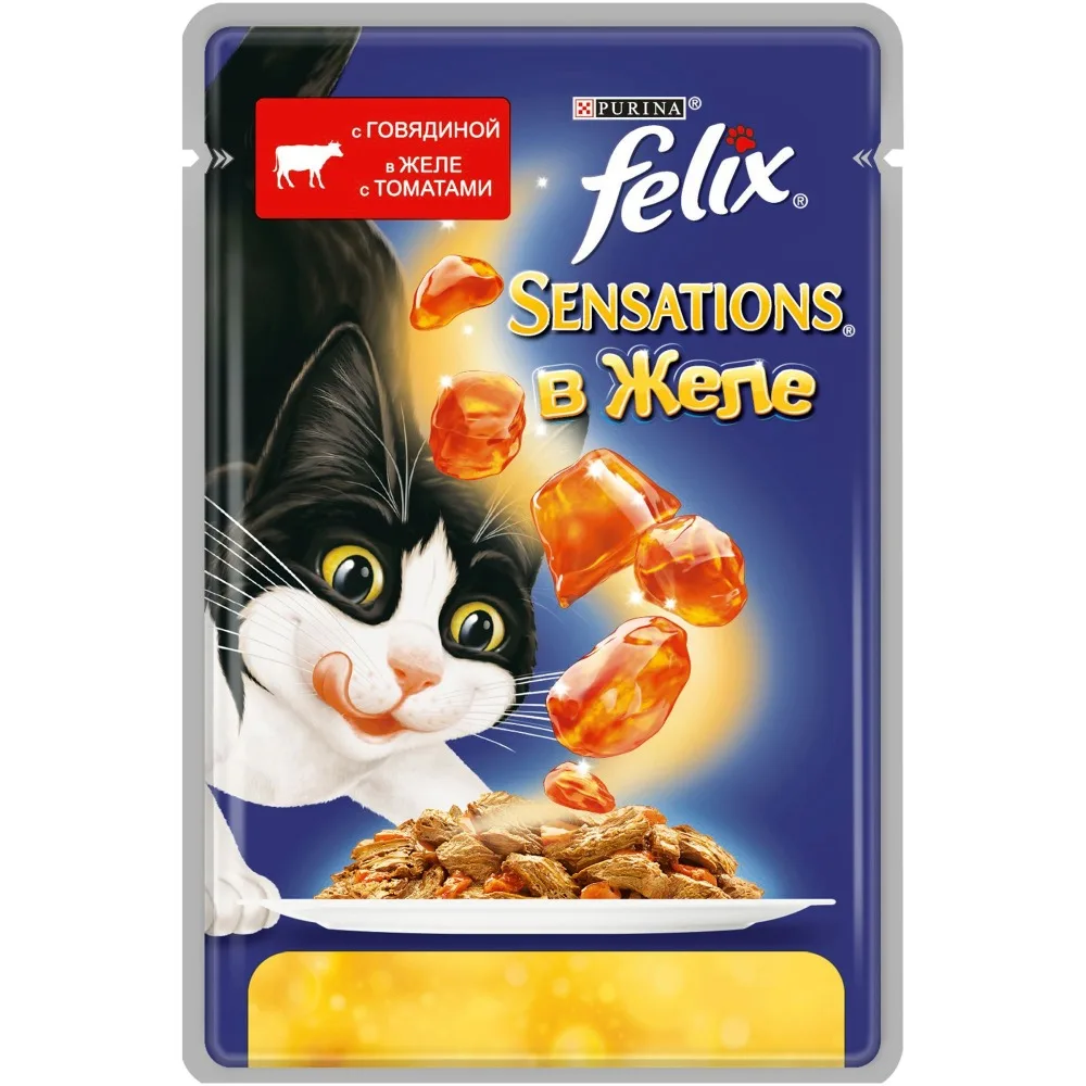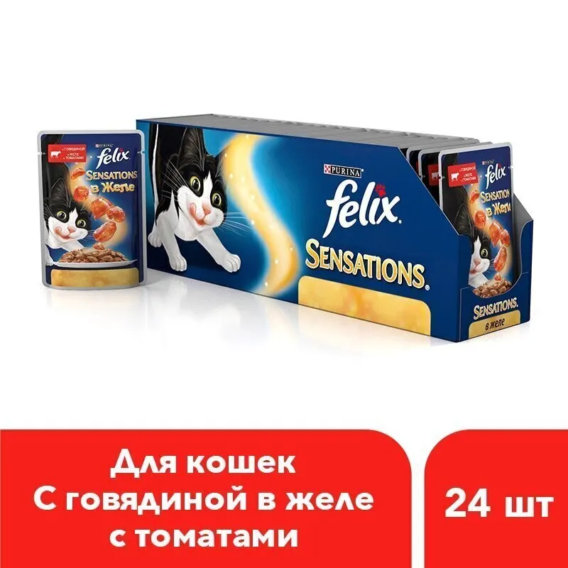 Влажный корм Felix Sensations для кошек с говядиной в желе с томатами, Пауч, 24х85 г.