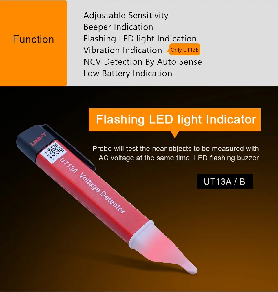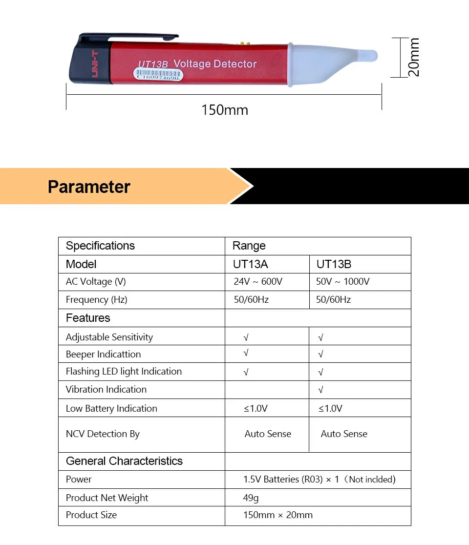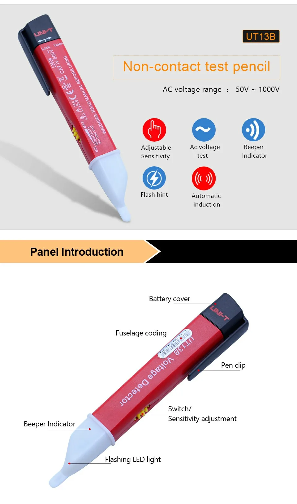 UT13 серия Бесконтактный детектор является усовершенствованным бесконтактным детектором напряжения переменного тока, сделанным UNI-T. Он может указывать на слухи, зрение и прикосновение. Он деликатный и легко носить с собой. Он может быть применен к дому, промышленности, электрическому Отделу, чтобы быстро определить, заряжается ли живая цепь на рабочем месте или дома. UT13A диапазон напряжения переменного тока 24V ~ 600V.