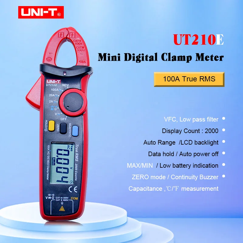 UT210E от UNI-T-это мини 100A True RMS Автоматический диапазон цифровой клещи с 2000 счетом дисплея и функцией VFC. Удобно использовать в узком пространстве.