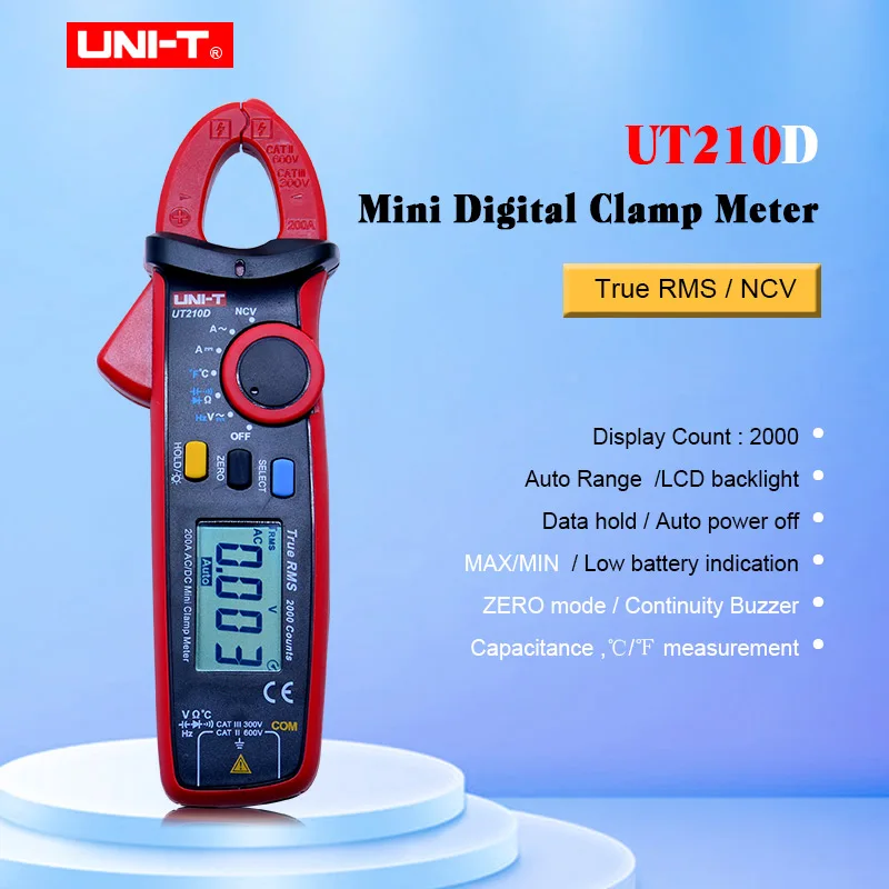 UT210D от UNI-T представляет собой мини 200A True RMS Автоматический диапазон цифровой клещи с 2000 счетом дисплея. Это портативное и многофункциональное устройство.