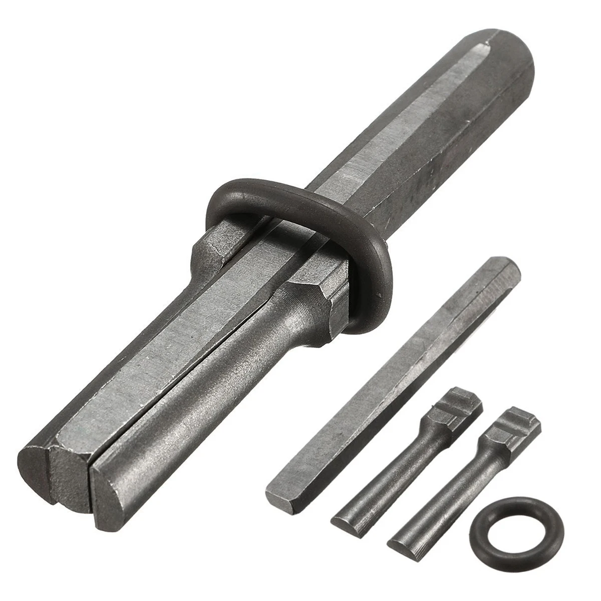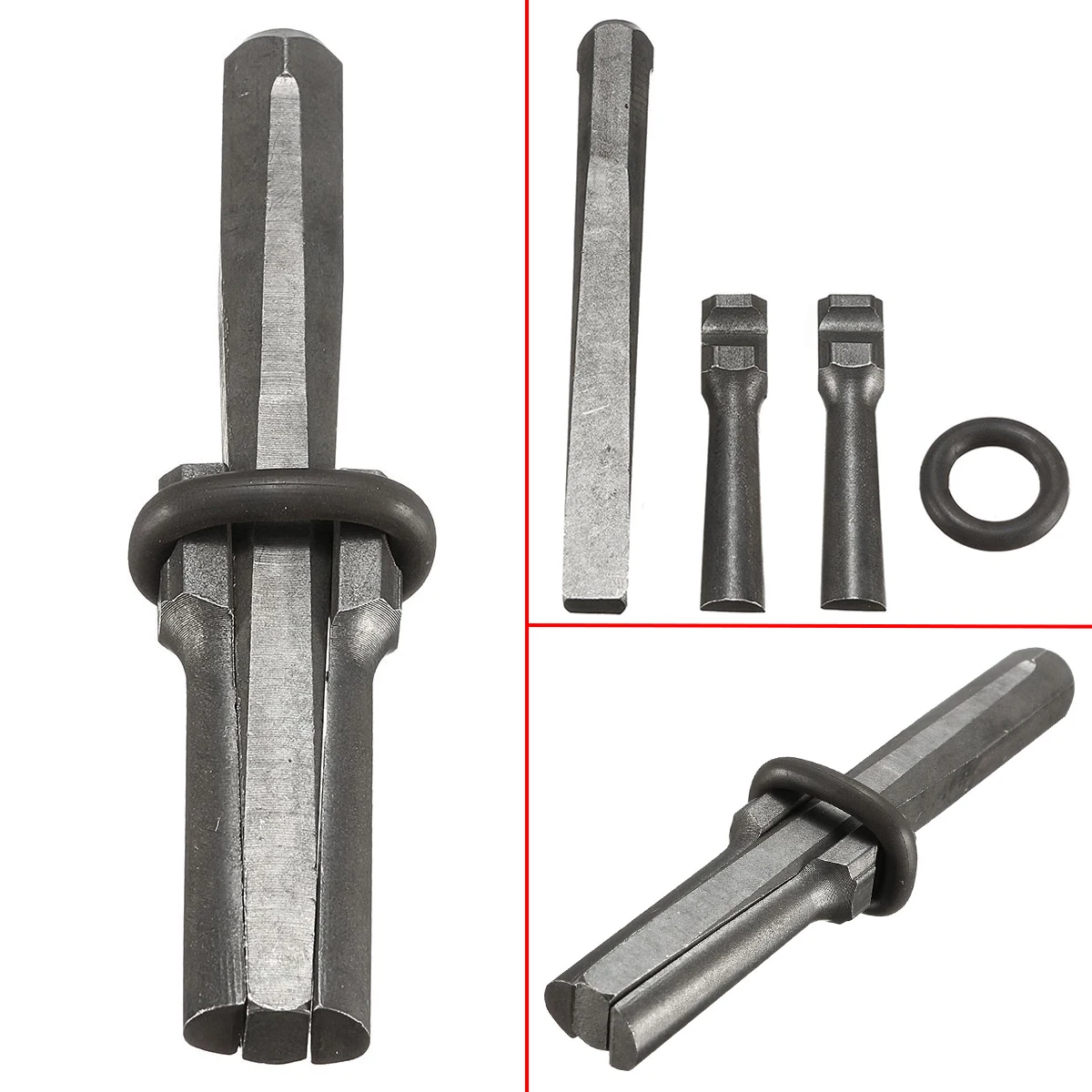 Состоит из центрального клина и 2 клиньев, сначала с карьерами, специально просверленными отверстиями в отверстии для удаления остатков порошка, две большие клиновые головки вниз, плоскость помещается в отверстие, затем поместите вверх небольшой клин в середине клина. Наконец, удар молотком.