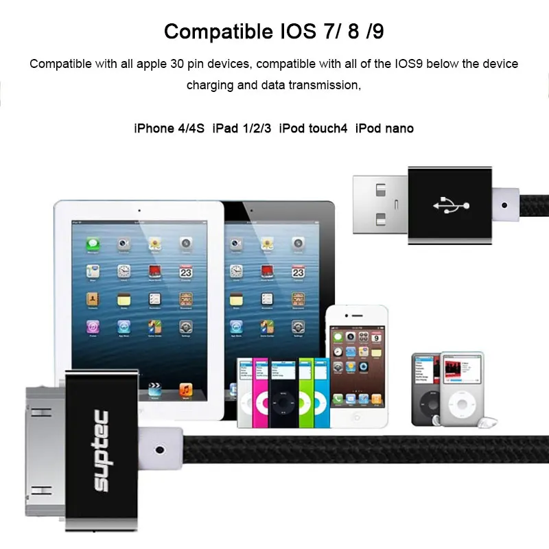 USB-кабель SUPTEC для iPhone 4 4S, нейлоновый плетеный провод, 30-контактный зарядный кабель для iPad 1 2 3 iPod Nano, шнур для передачи данных