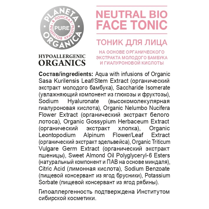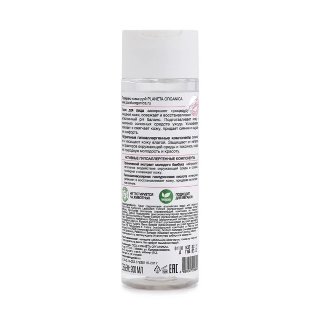 Тоник для лица завершает процедуру очищения кожи, освежает и восстанавливает естественный pH баланс. Подготавливает кожу к нанесению основных средств ухода. Успокаивает, выравнивает и смягчает кожу, придает сияние и ощущение комфорта. Натуральные гипоаллергенные компоненты освежают и насыщают кожу влагой. Защищают от негативных факторов окружающей среды и токсинов, сохраняя природную молодость и красоту. Органический экстракт молодого бамбука нейтрализует негативное воздействие окружающей среды и стресса, тонизирует и освежает кожу. Высокомолекулярная Гиалуроновая кислота интенсивно увлажняет и восстанавливает кожу, придавая естественное сияние Способ применения: нанесите небольшое количество тоника на кожу лица с помощью ватного диска. Не требует смывания водой. Состав: Aqua with infusions of Organic Sasa Kurilensis Leaf/Stem Extract (органический экстракт молодого бамбука), Saccharide Isomerate (увлажняющий компонент из глюкозы и фруктозы), Sodium Hyaluronate (высокомолекулярная гиалуроновая кислота), Organic Nelumbo Nucifera Flower Extract (органический экстракт белого лотоса), Organic Gossypium Herbaceum Extract (органический экстракт хлопка), Organic Leontopodium Alpinum Flower/Leaf Extract (органический экстракт эдельвейса), Organic Triticum Vulgare Germ Extract (органический экстракт пшеницы), Sweet Almond Oil Polyglyceryl-6 Esters (натуральный компонент и ПАВ на основе миндаля), Citric Acid (лимонная кислота), Sodium Benzoate (пищевой консервант из ягод брусники), Potassium Sorbate (пищевой консервант из ягод рябины).