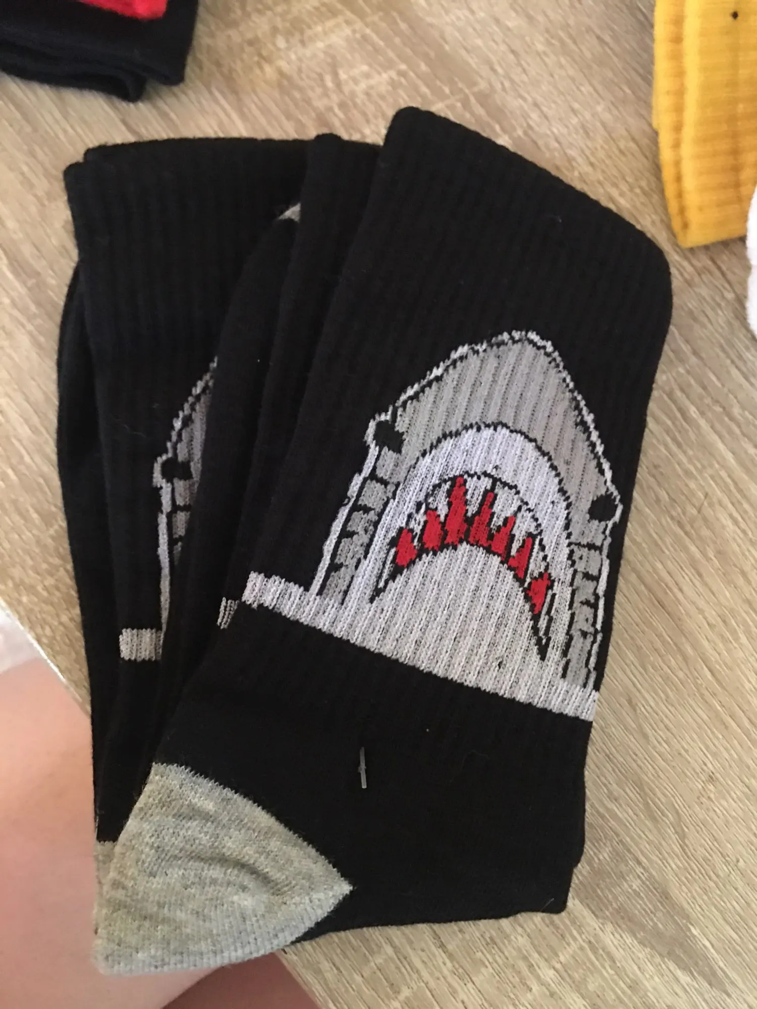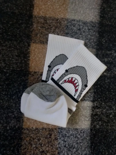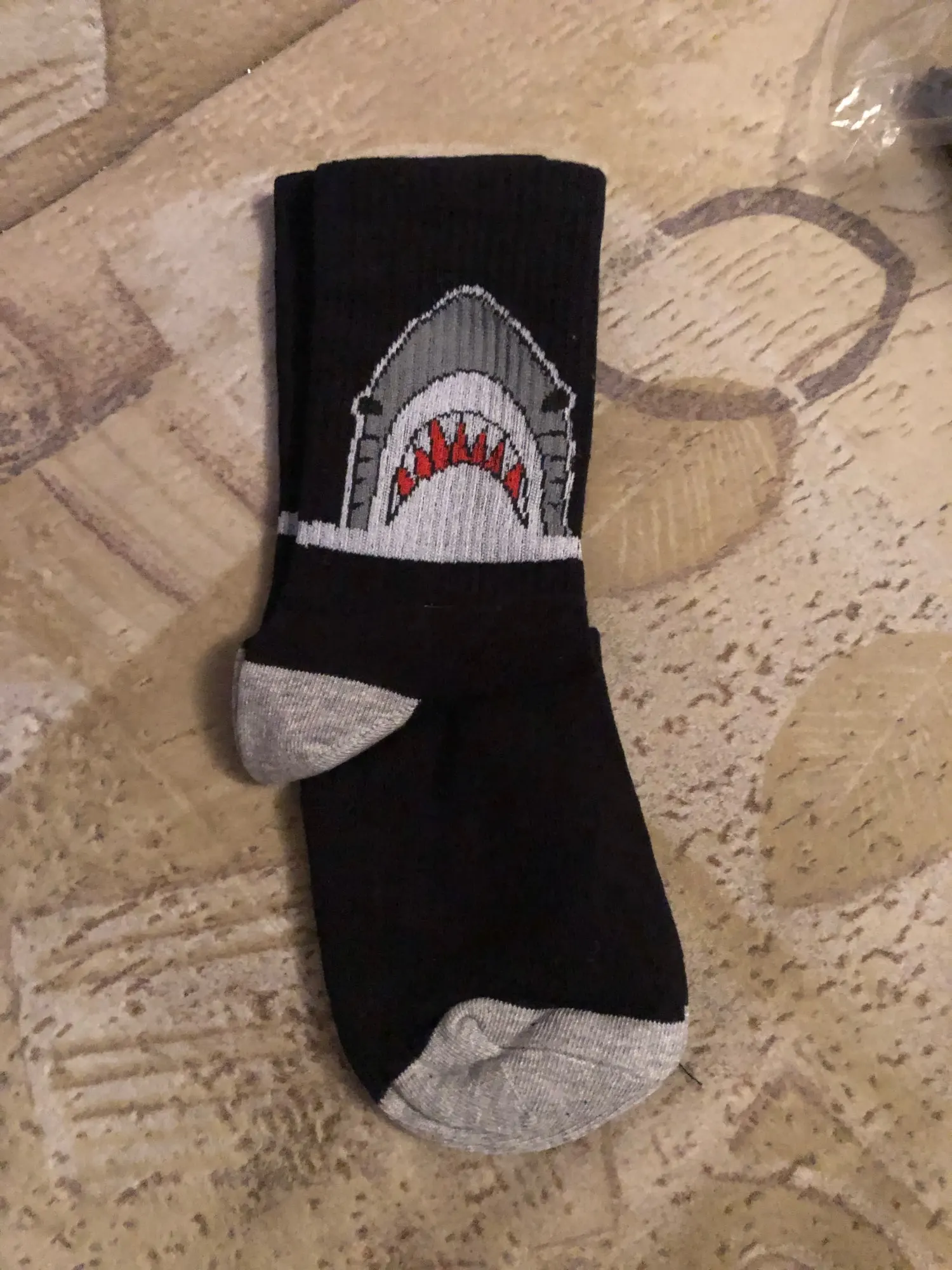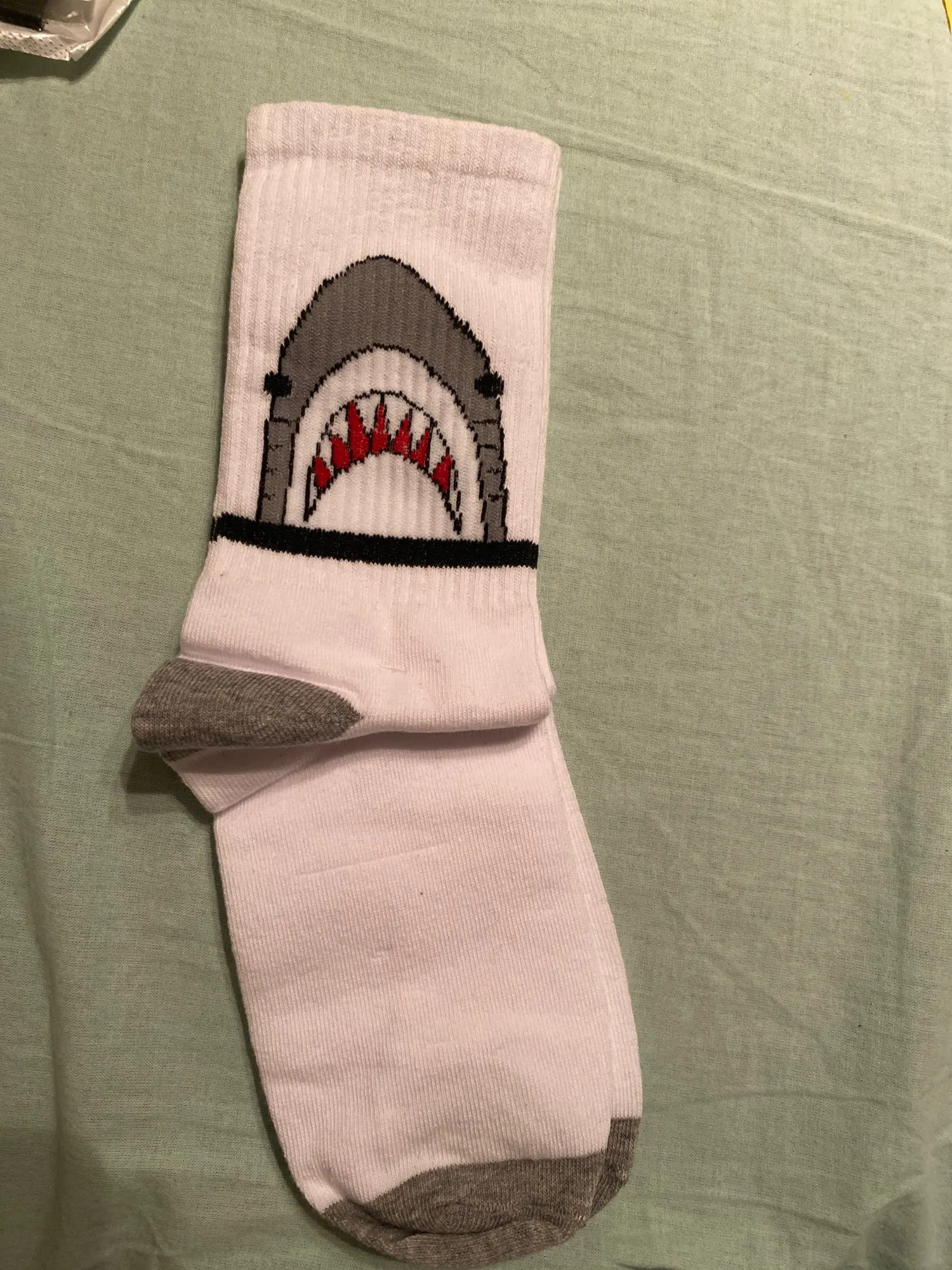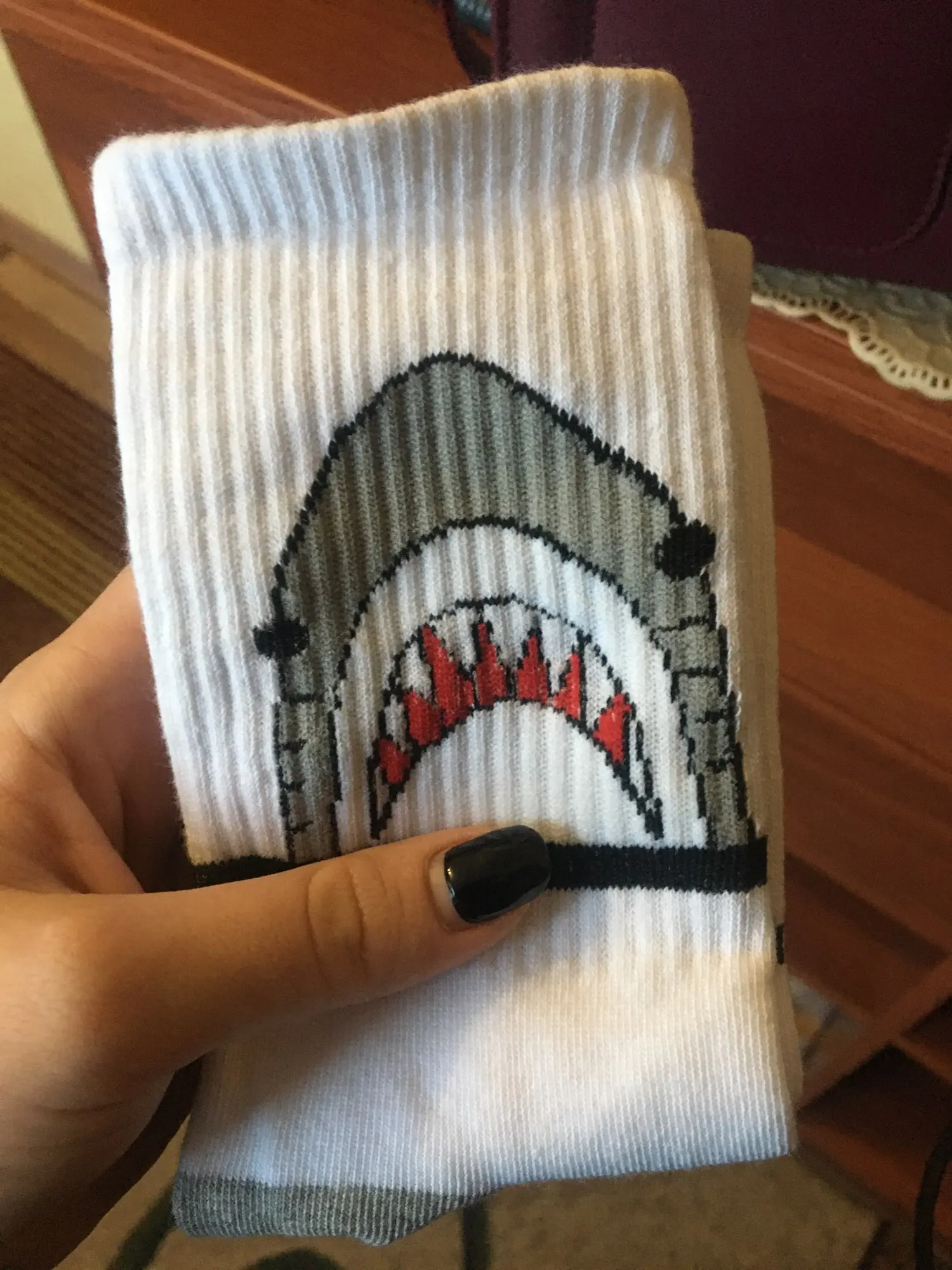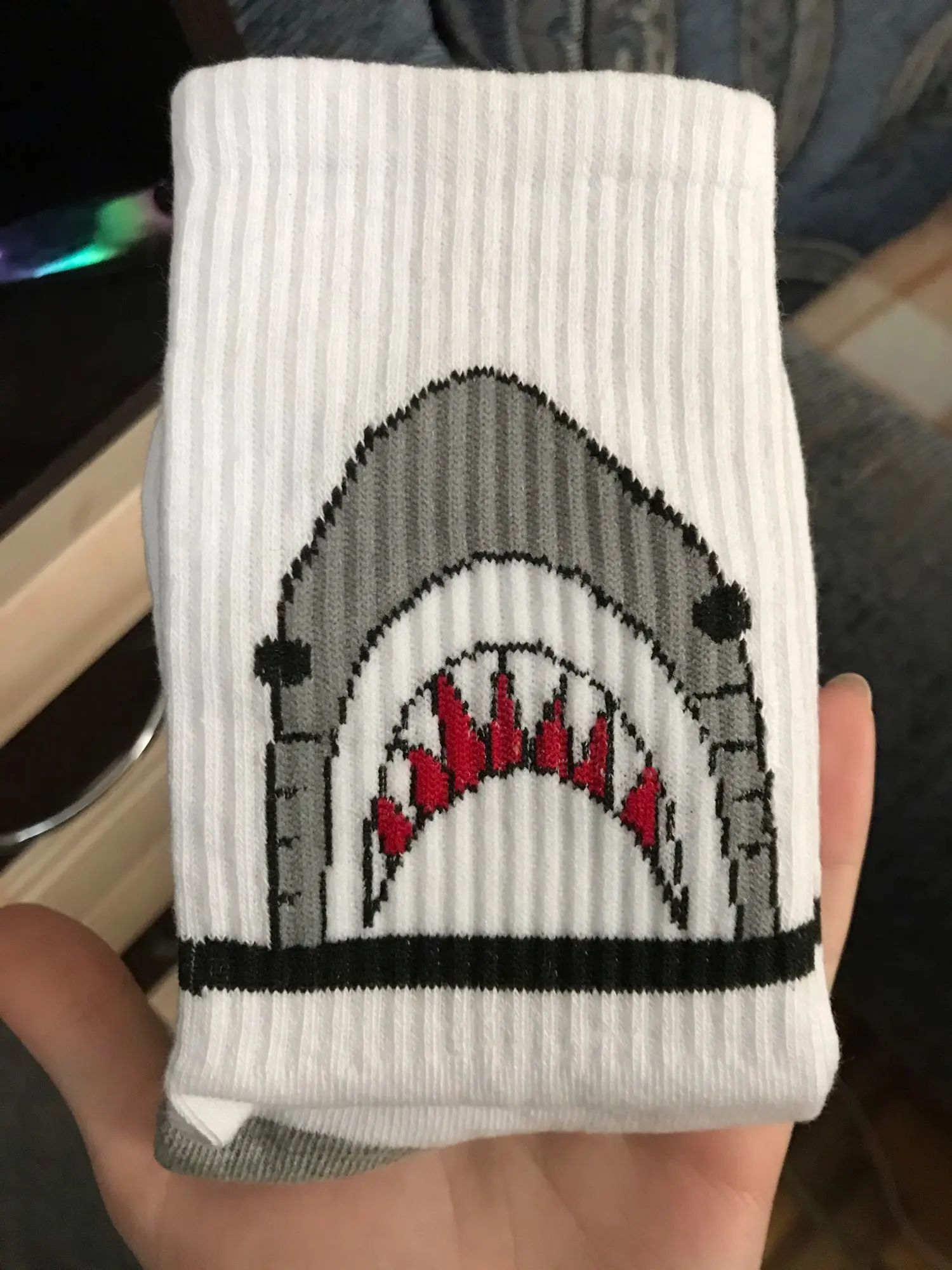 Носки с акулой очень круто смотрятся. Из минусов могу отметить только качество нанесенного рисунка, есть маленькие пробелы. Но это заметно, если только тщательно всматриваться, держа носки в рука