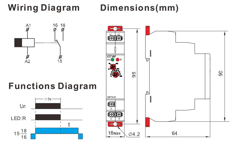 Функциональные особенности -GRT8-D истинная задержка выключения без напряжения питания -Временной диапазон (регулируется поворотным переключателем и fi ne Настройка потенциометром): 0,1 s - 10 мин. -Выход: 1SPDT 16A/AC1