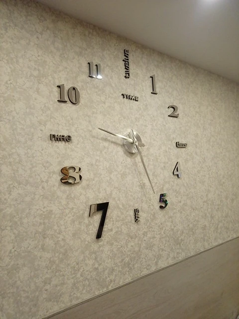 Часы пришли быстро, повесили с помощью линейки из комплекта и лазерного уровня, все супер, смотрится стильно, работают бесшумно ,на пальчиковой батарейке. Центр со стрелками сразу закрепили понадёжнее )) многие пишут, что не выдерживает скотч производителя.
