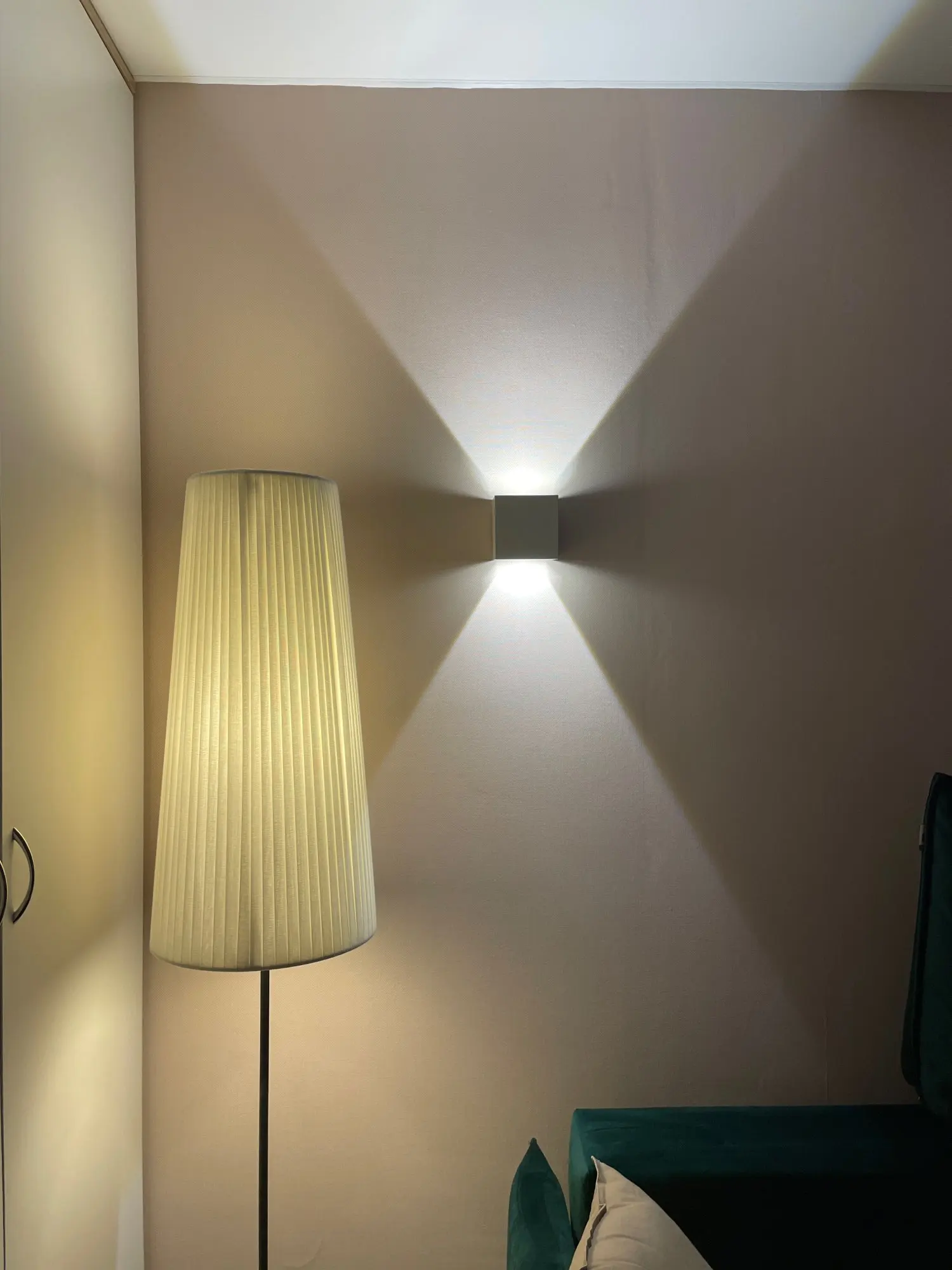 Тёплый свет от лампы - далеко не тёплого оттенка. Это сразу бросается в глаза на фоне другого освещения в комнате. Отверстие для провода в углу задней стенки - это не очень удобно если необходимо сместить светильник вправо или влево.
