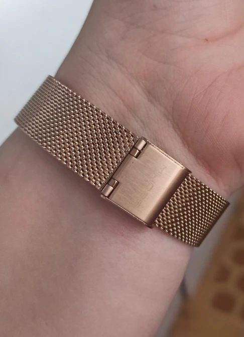 В целом неплохой ремешок. Однако, есть несколько замечаний. Был сложен пополам, из-за чего плетение немного деформировалось и расширилось, когда пришлось регулировать длину перемещением пряжки, в месте деформации вылезла одна нить проволоки, пришлось аккуратно ее откусить. На прочностные характеристики не повлияло, визуально не заметно (спрятано под пряжку). Кроме того, небольшие потёртости на самом корпусе и на пряжке (прямо под пленкой, были заклеены сверху).