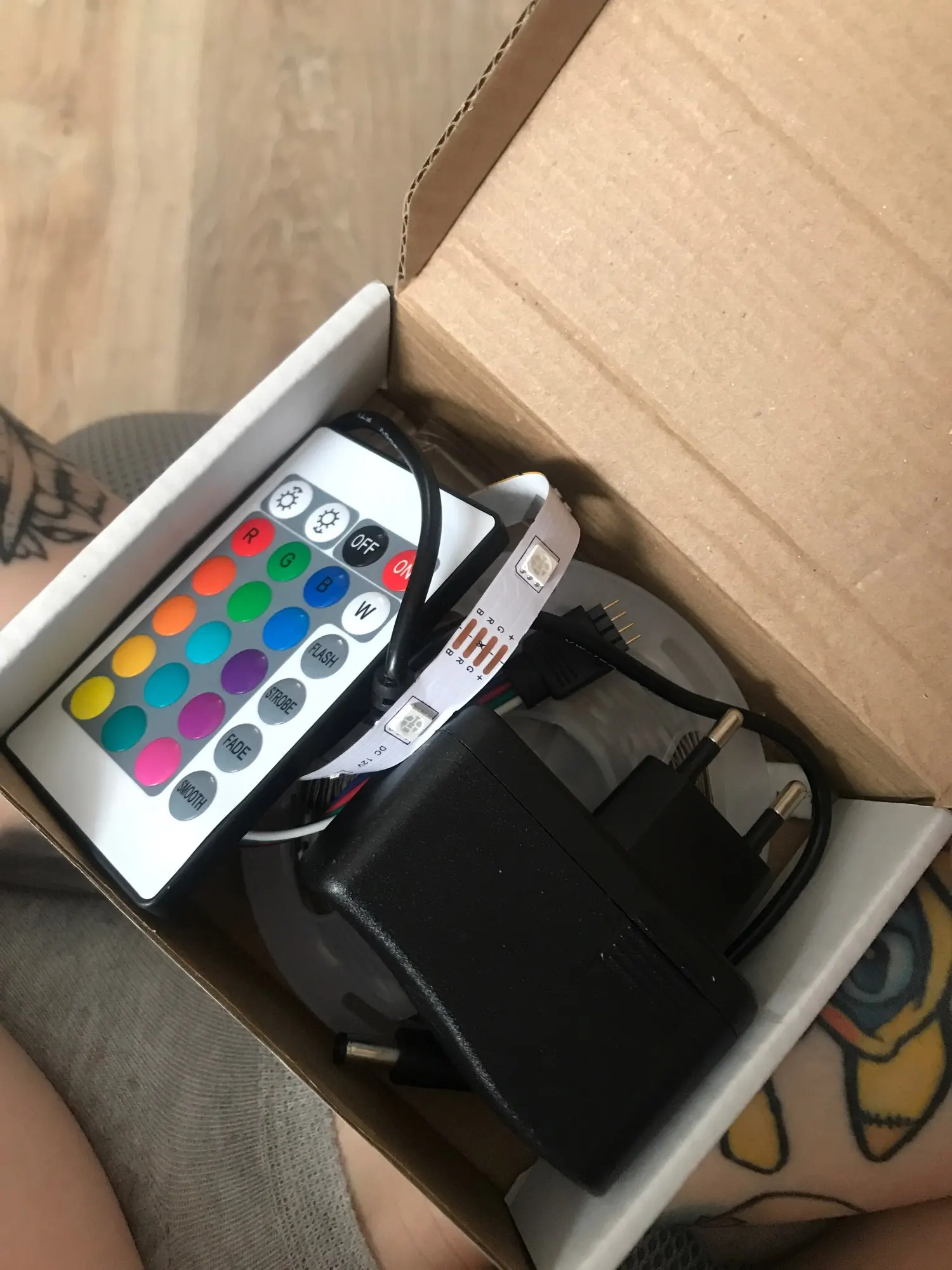 Доставили за 10 дней! Светят ярко. На стену приклеились без проблем, прочно. Можно оторвать и наклеить заново. Все настроилось через телефон, можно менять цвета через телефон, также светодиоды могут подстраиваться под музыку. Для того, чтобы установить приложение надо считать Q R код на адаптере. Вам выдаст ссылку на приложение, а дальше произойдет синхронизация через блютуз.