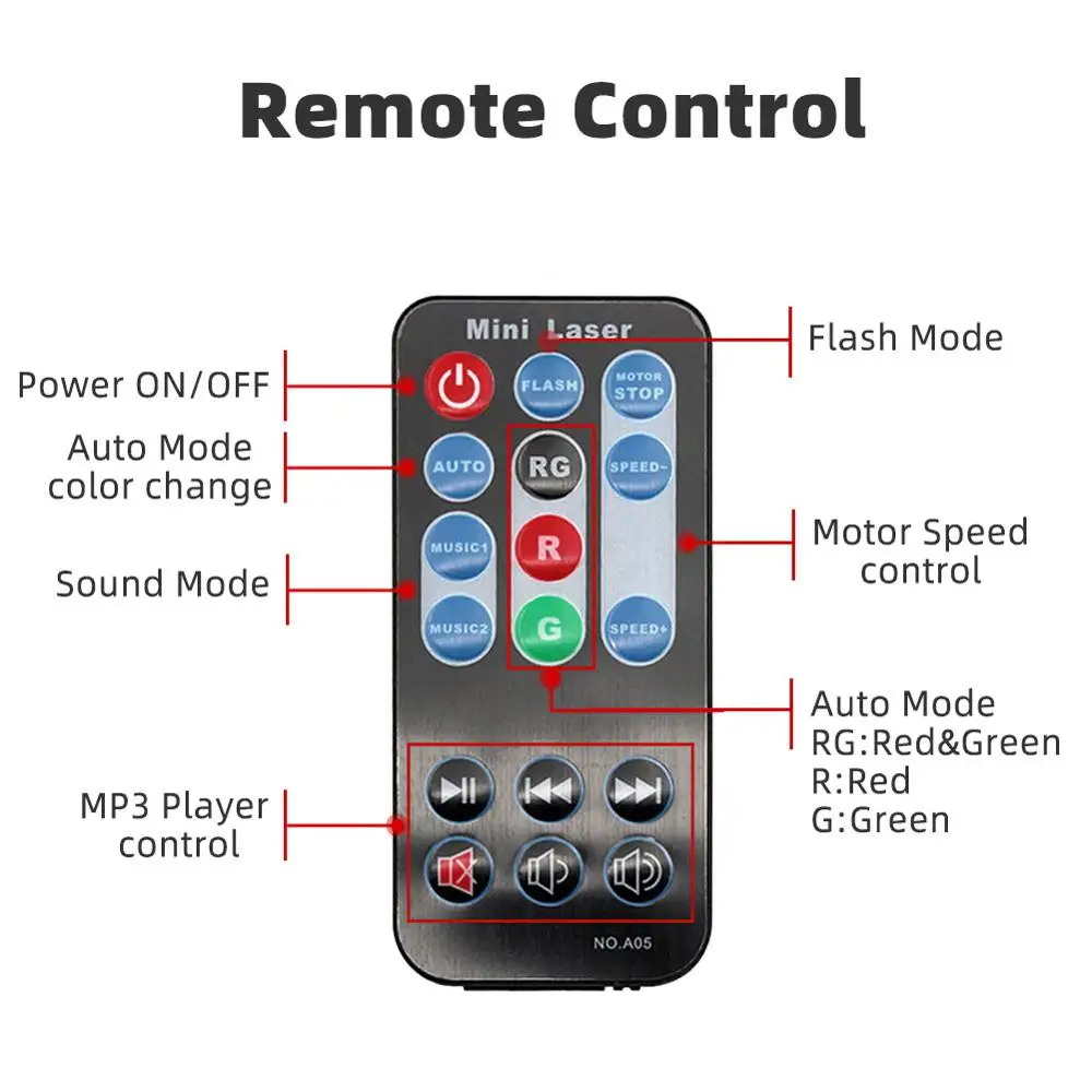 3. После включения, вы можете переключаться между семью различными эффектами, затем авто (красный и зеленый), вспышка, красный, зеленый, авто (обесцвечивание), музыка 1 (стробоскоп) И музыка 2 (обесцвечивание) эффект. Нажмите кнопку mode,