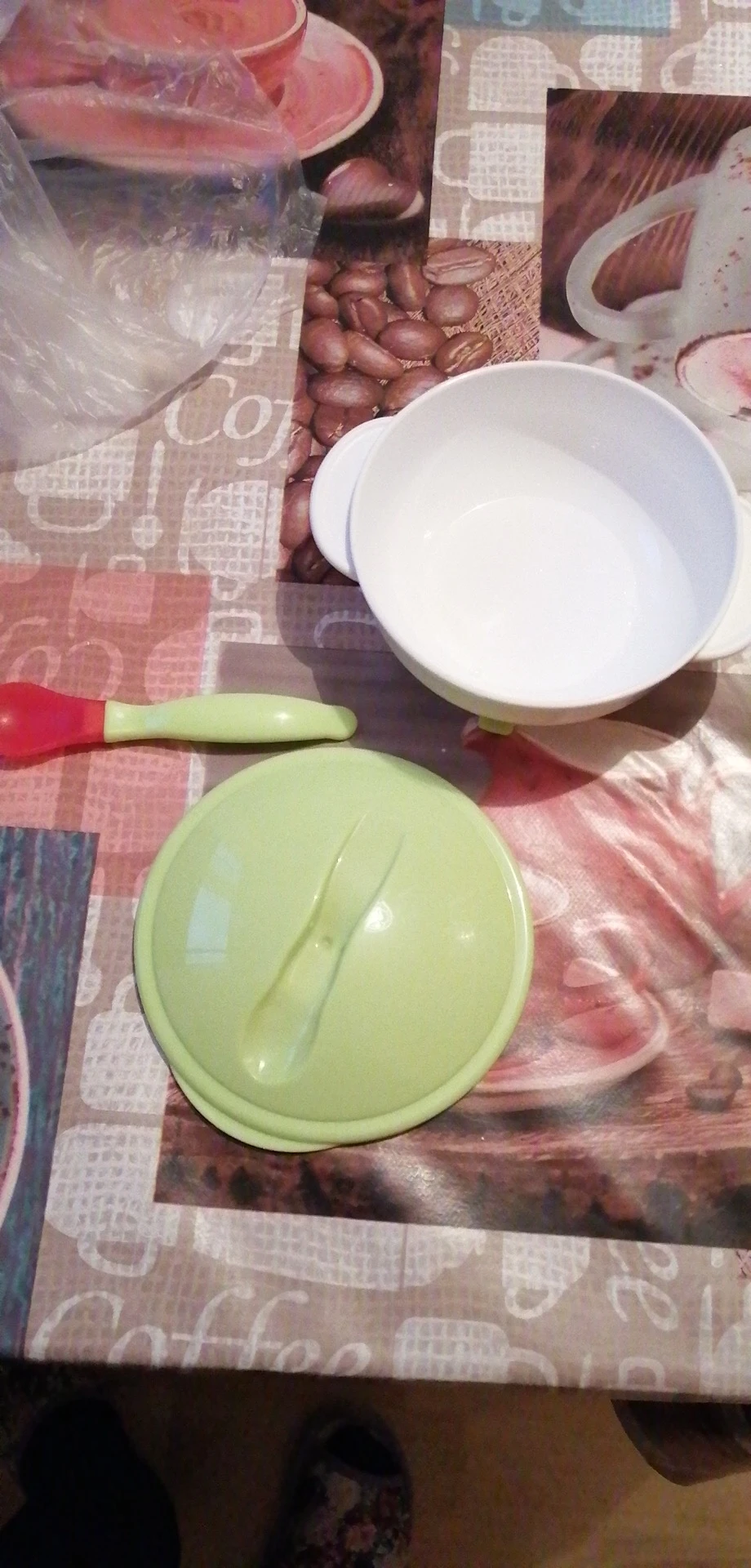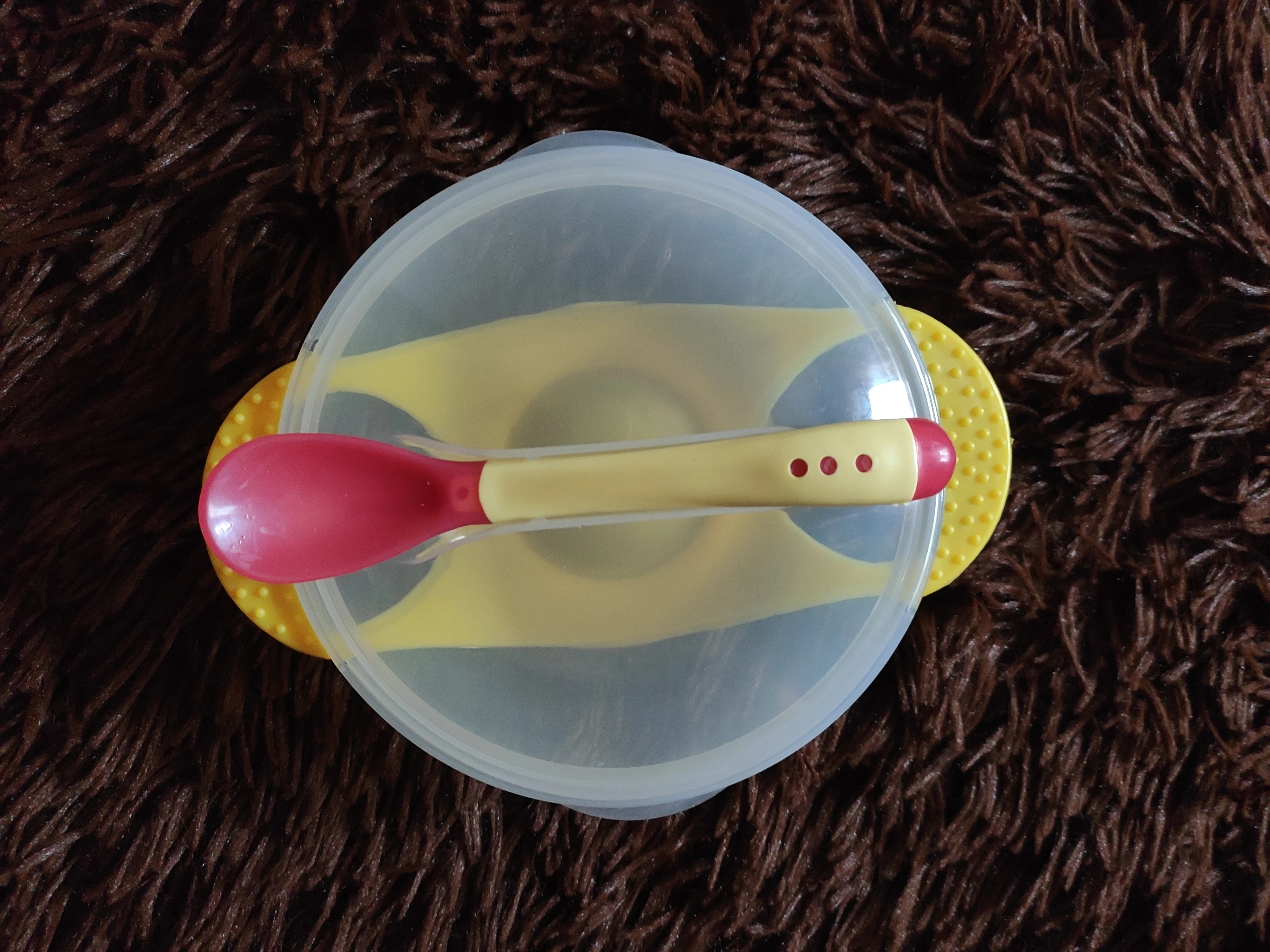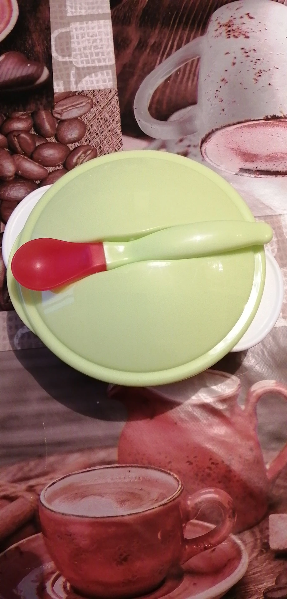 доставка долгая, но в срок защиты уложились. тарелочка неплохая, но присоска очень слабая, ложка белеет от горячего.
